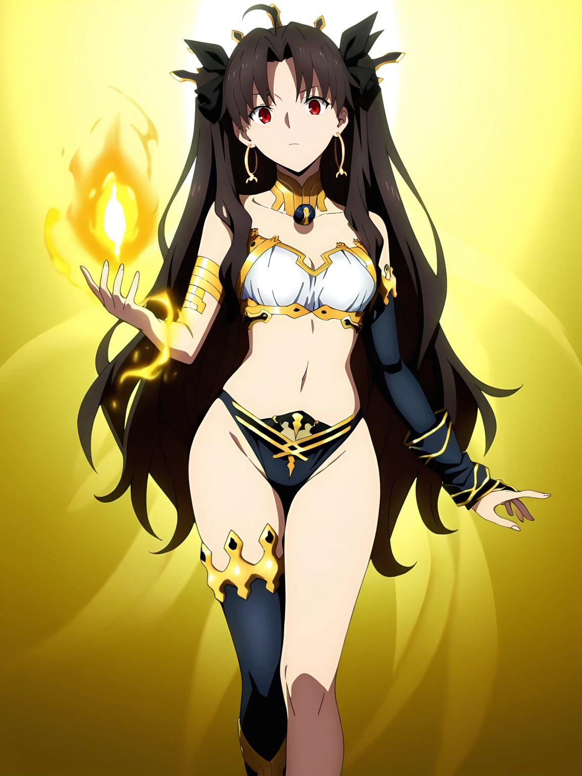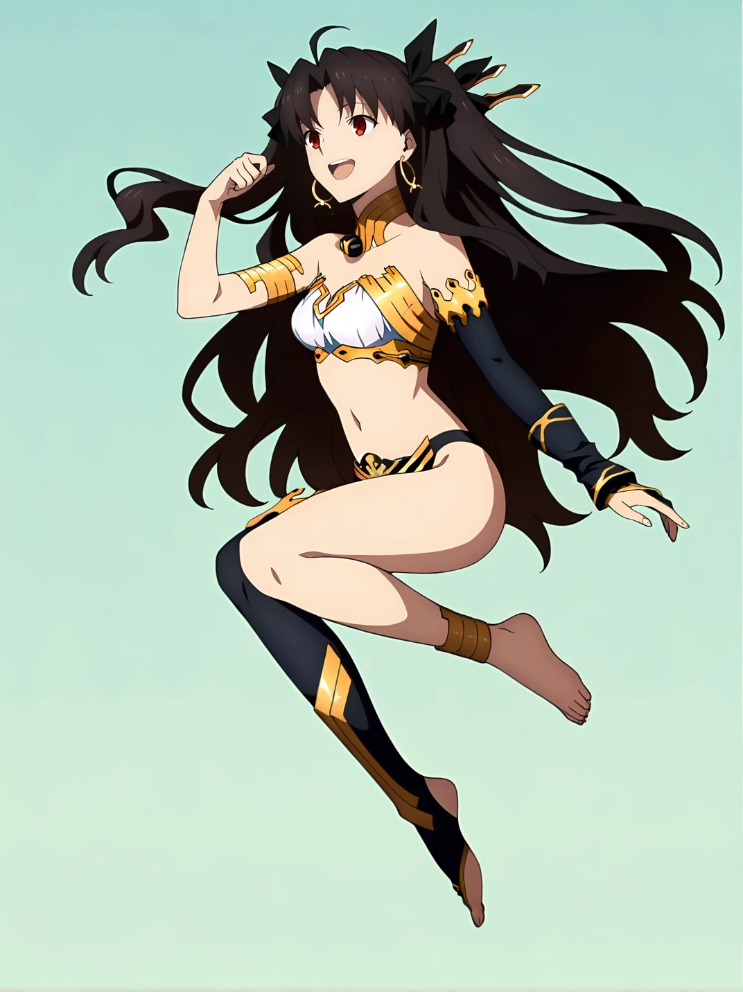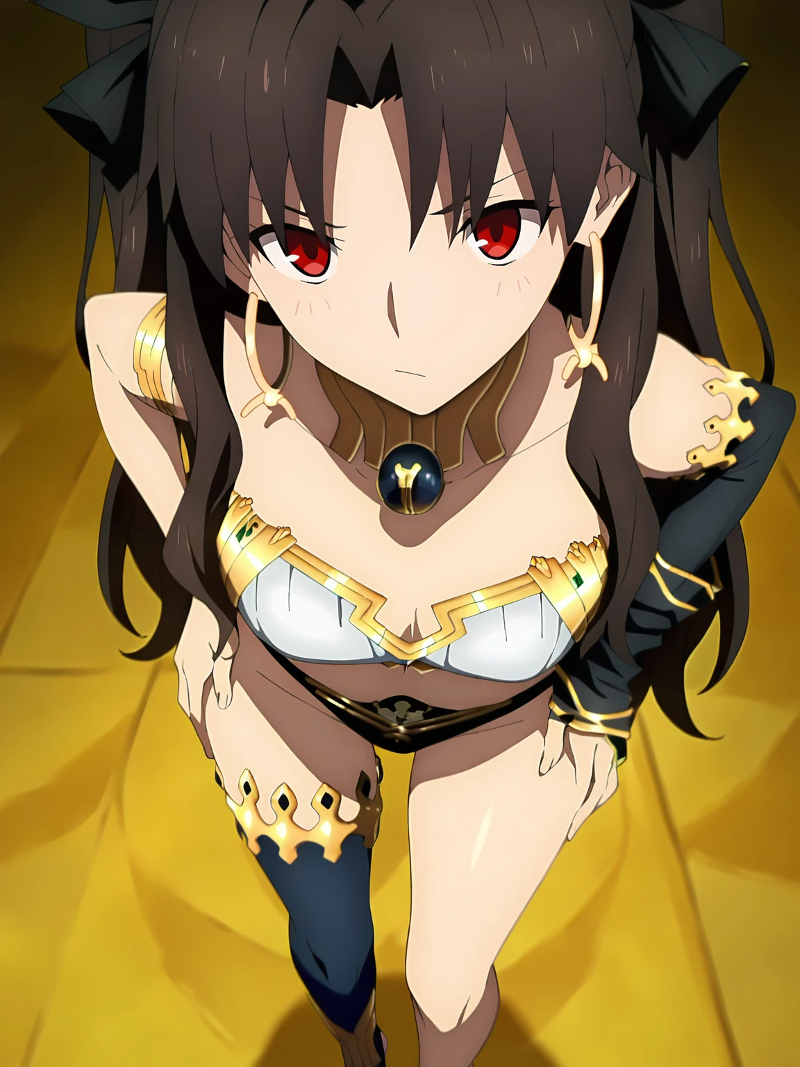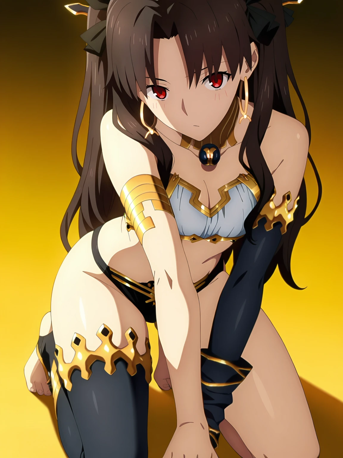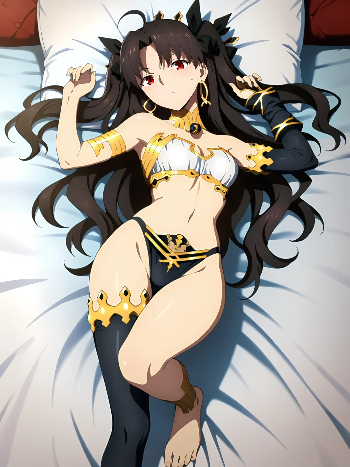 ishtar, 1girl, solo, long hair, brown hair, red eyes, earrings, hair ornament, choker, strapless top, right arm sleeve, black bikini, gold trim, ornate accessories, one thighhigh, barefoot, gold anklet