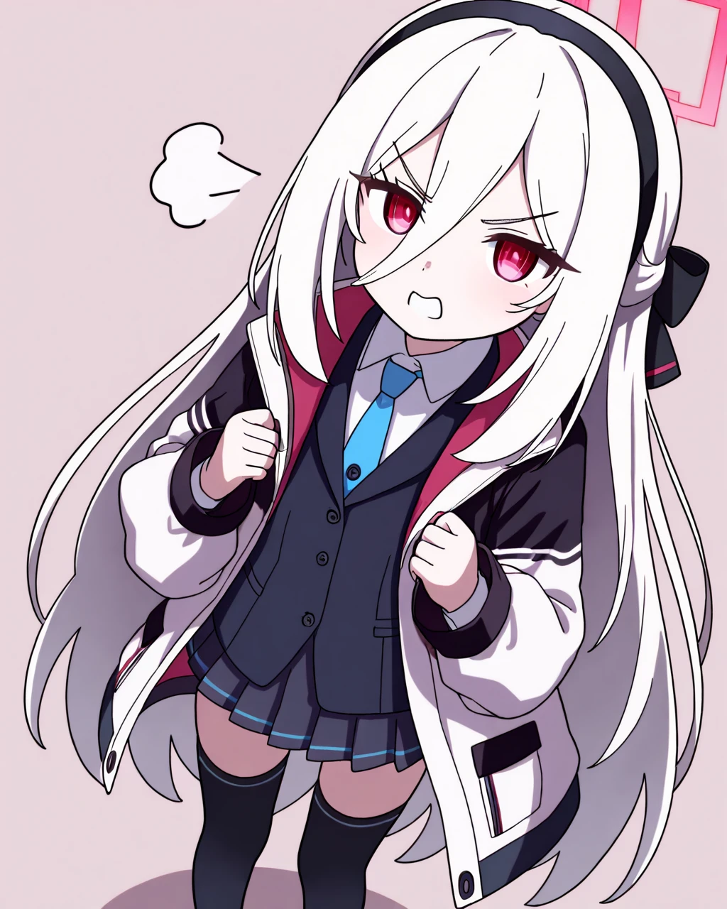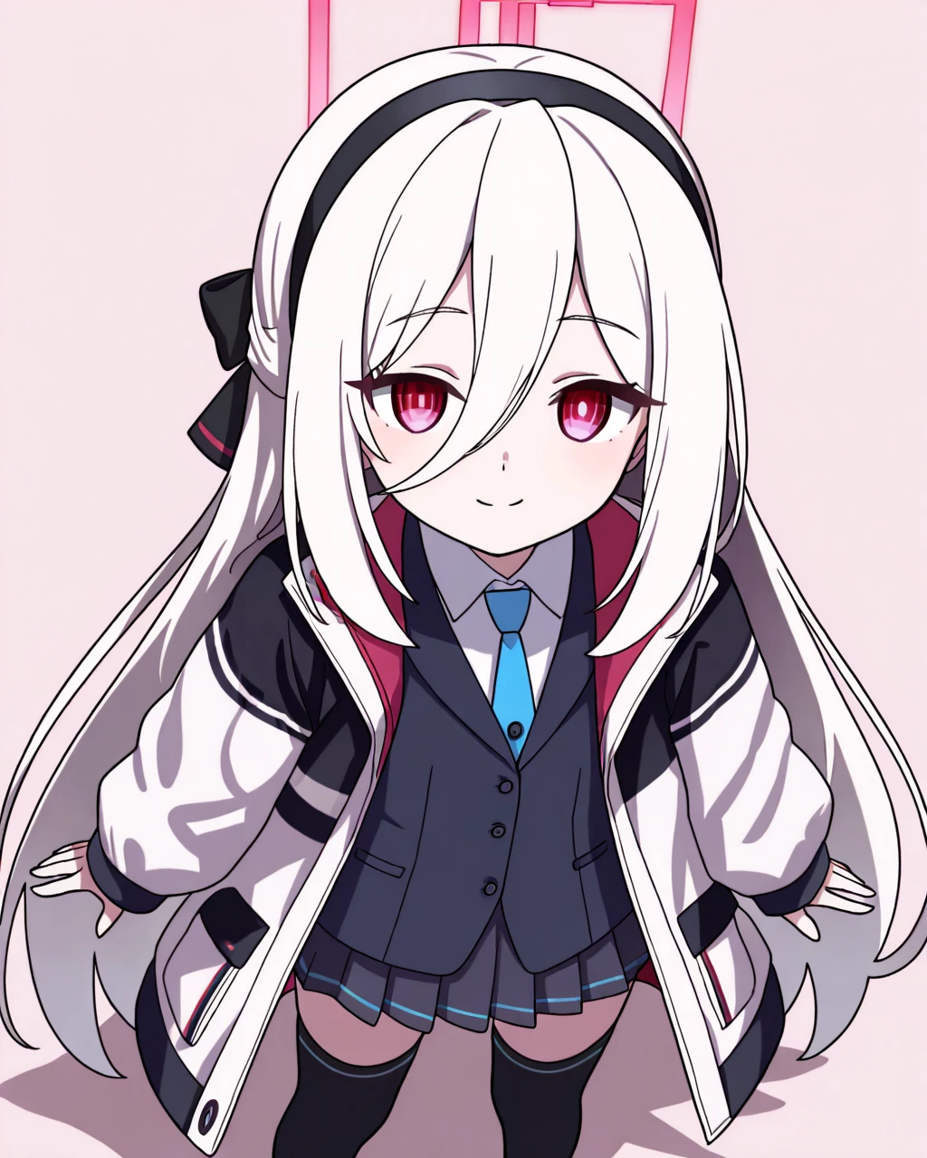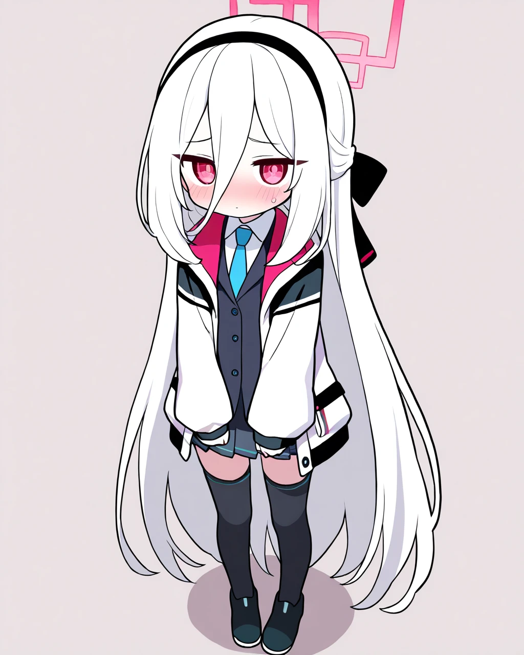 halo,long hair,jacket,black hairband,red eyes,necktie,blue necktie,skirt,very long hair,black thighhighs,hairband,shirt,white jacket,two-sided jacket,white shirt,hair between eyes,white hair,black shoes,pleated skirt,shoes,collared shirt第一次做角色的LoRA,所以有些bug的情况。比如在没有指明需要枪(其实也不像?)和鞋带的情况下出现,这时候请在反面提示词里加上gun,shoelaces来尽量避免