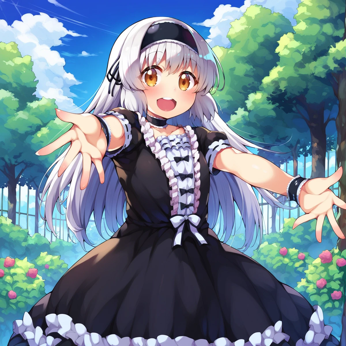 onesama,yellow eyes,long_hair,blush,looking at viewer,wrist_cuffs,white hair,hairband,black_dress,lolita_hairband,, huge penis, futanari, onesama_dark_balls, onesama_dark_penis