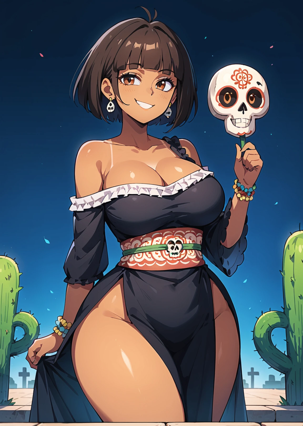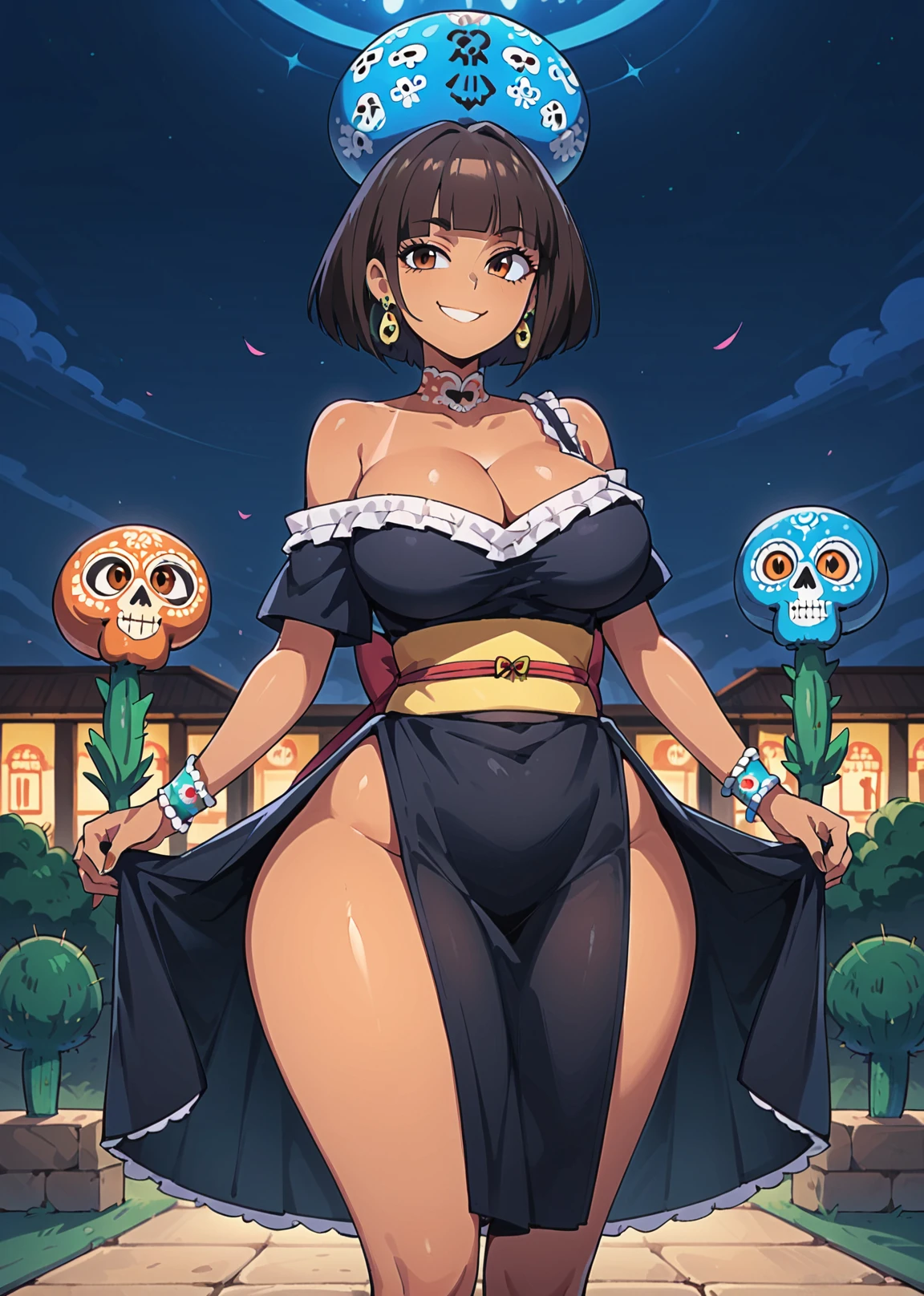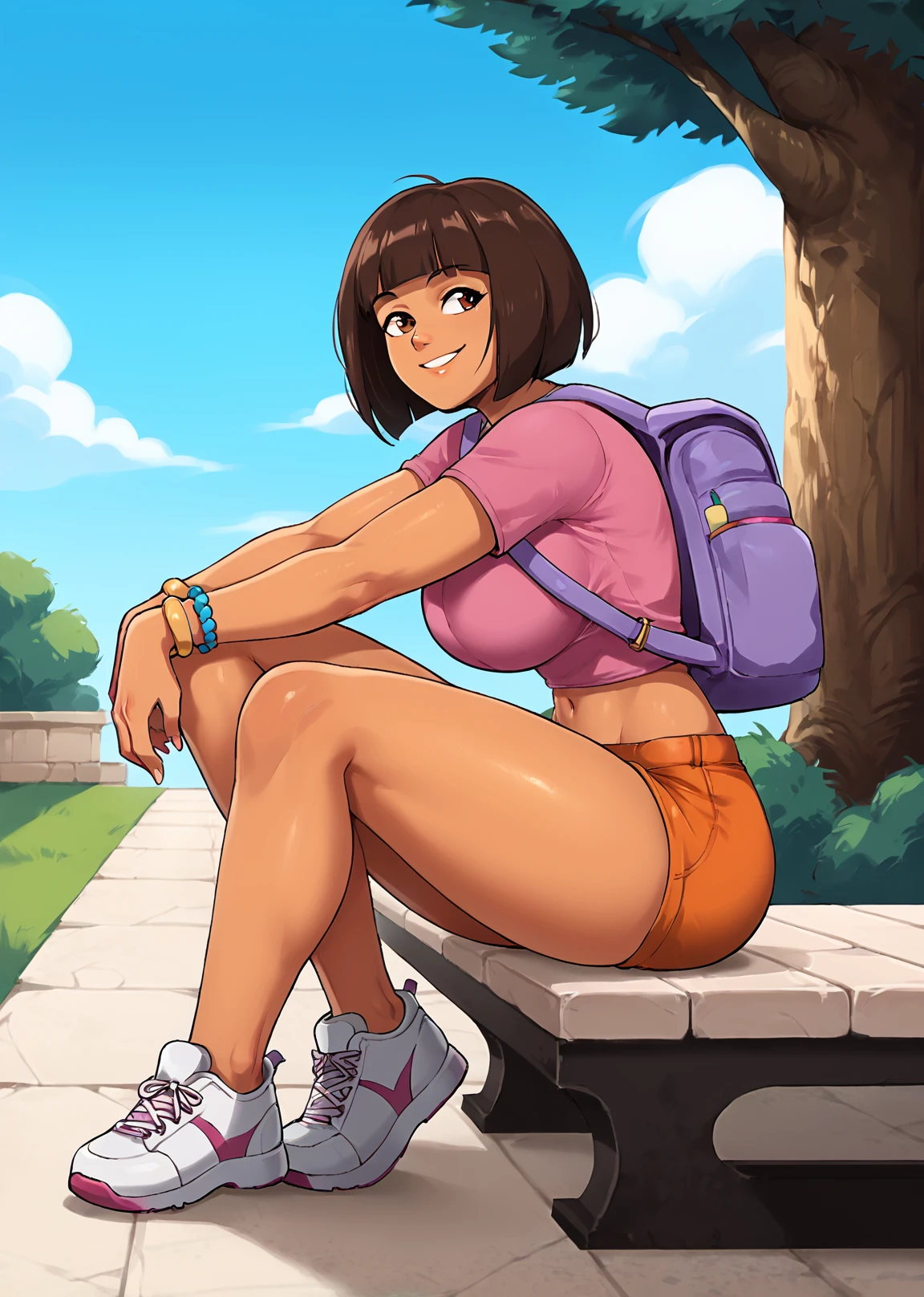 blunt bangs, short hair, pink shirt, midriff, orange shorts, white sneakers, bracelet, backpack