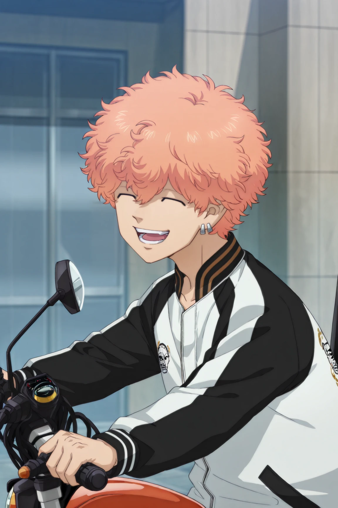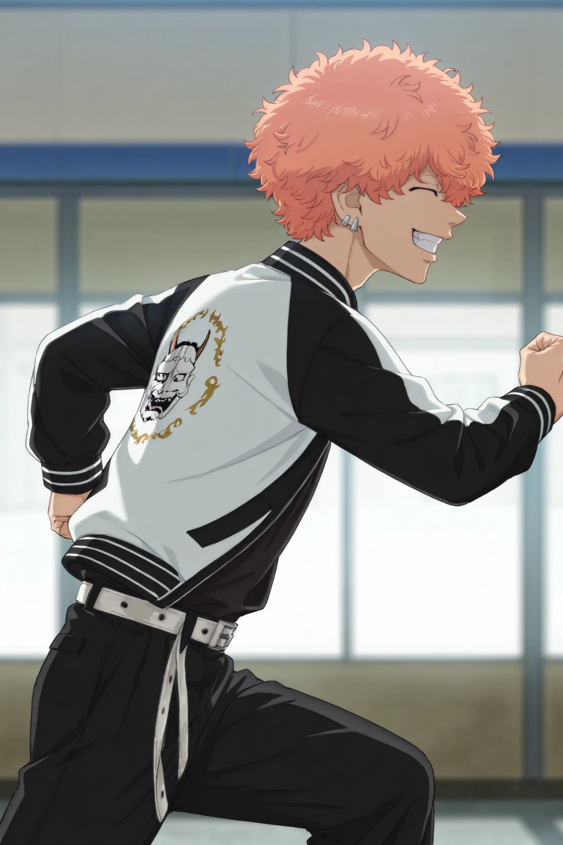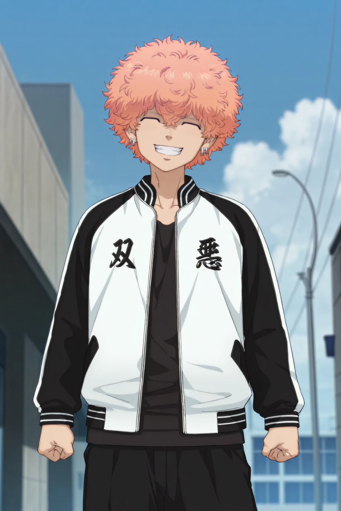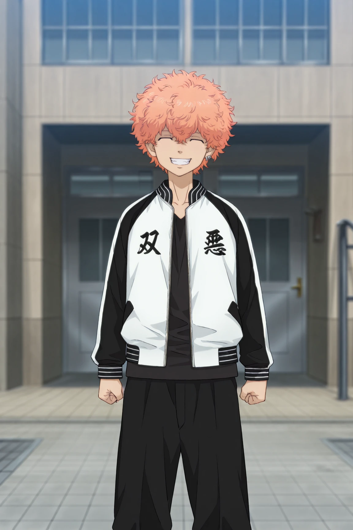 two-tone jacket, black shirt, black pants, white shoes