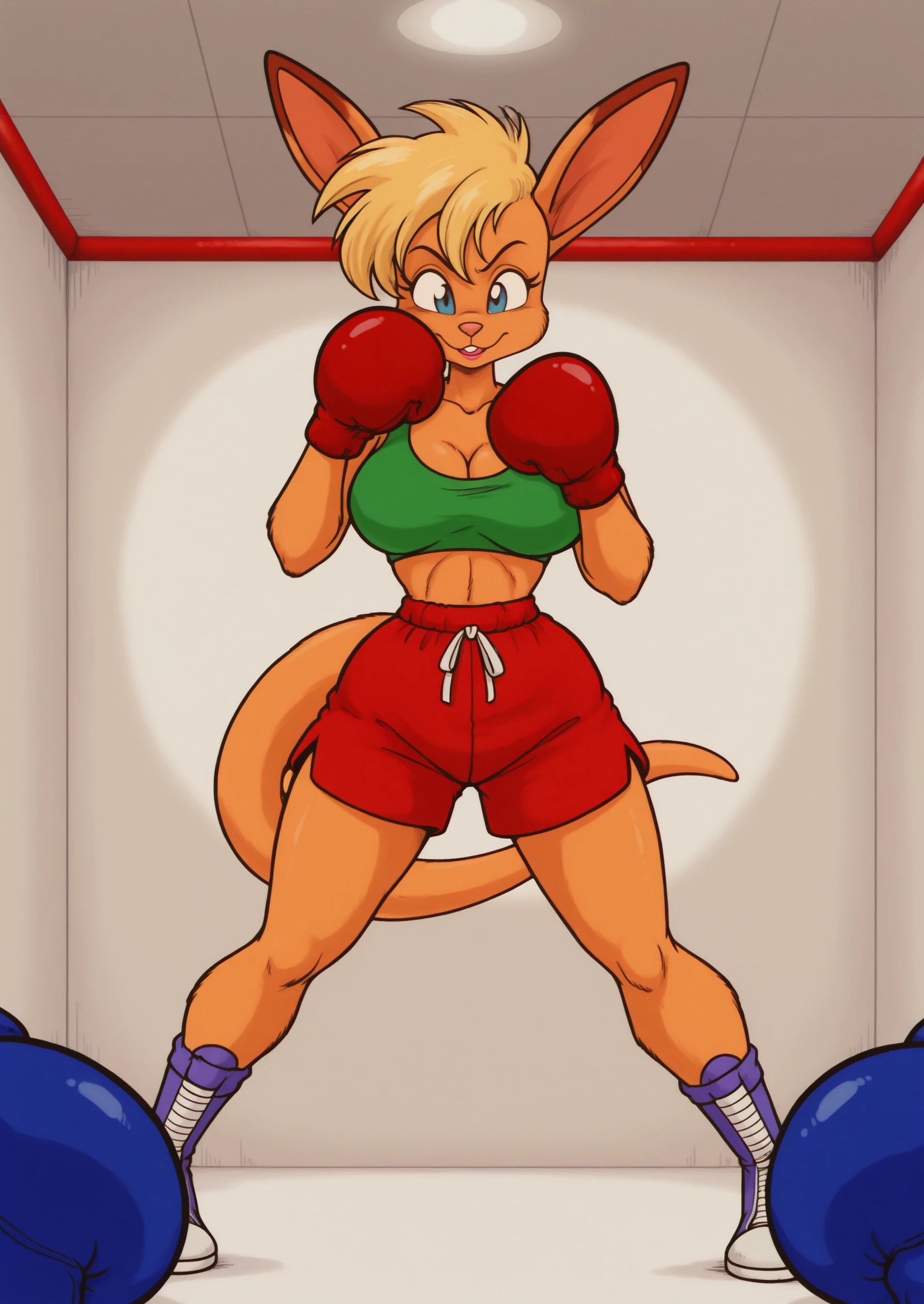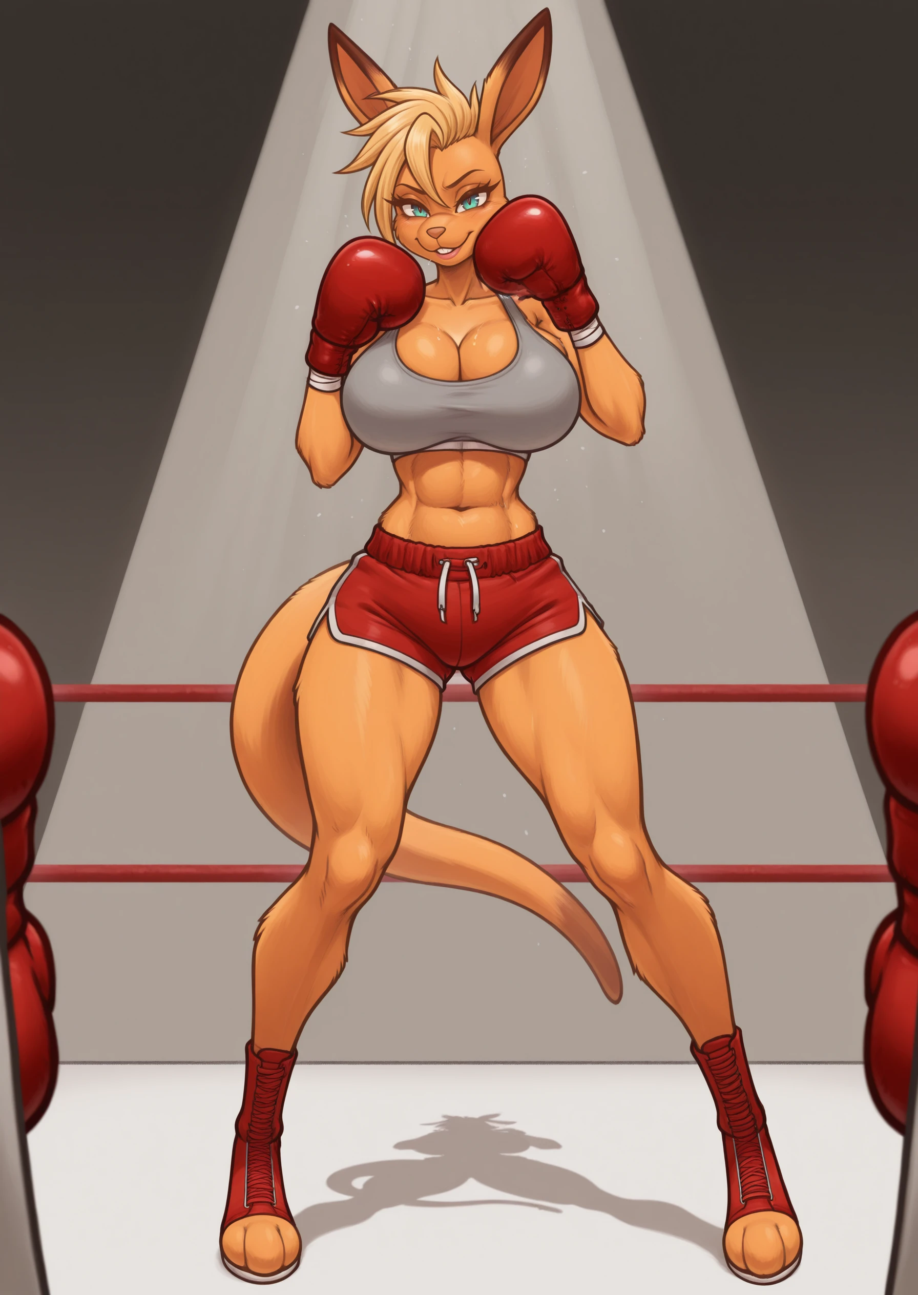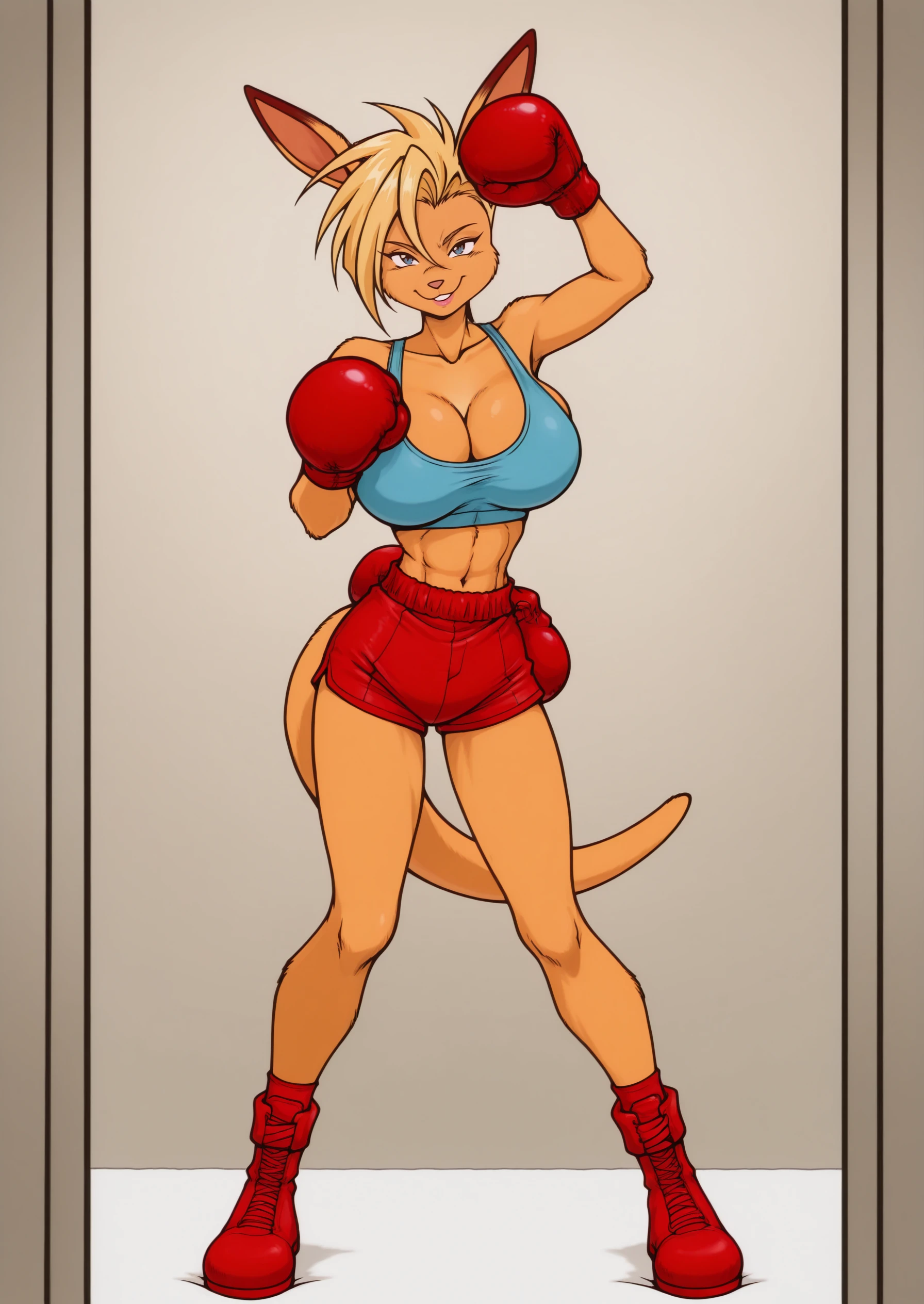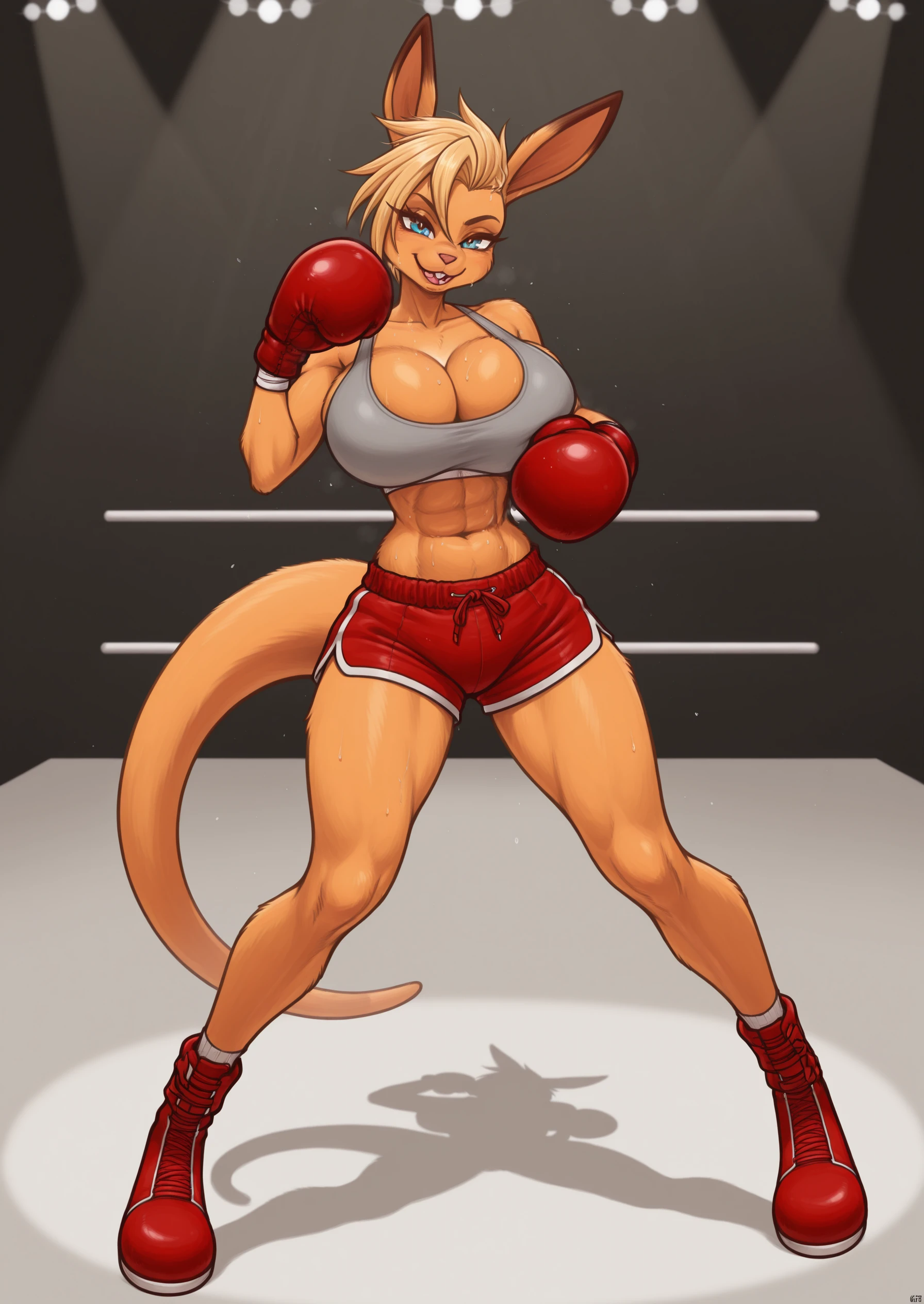 kangaroo, furry female, blonde hair, animal ears, pouch, tail,