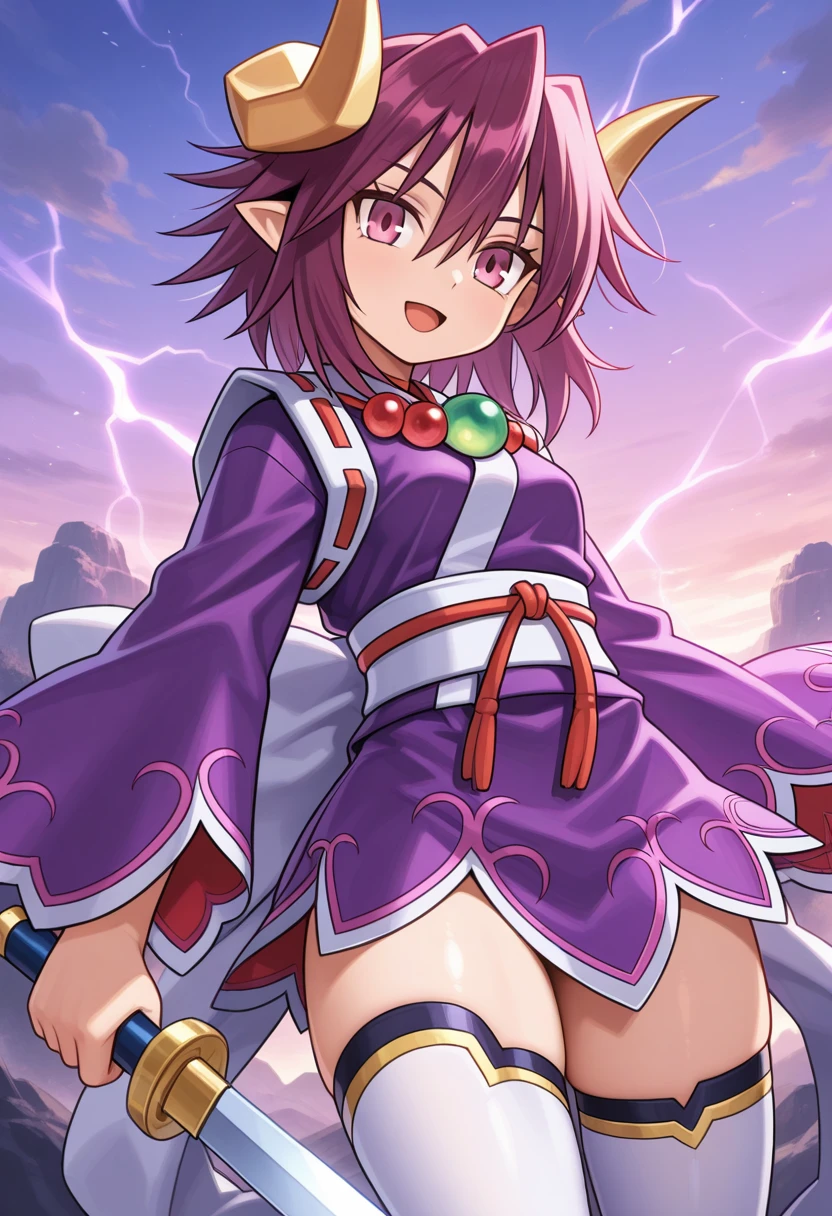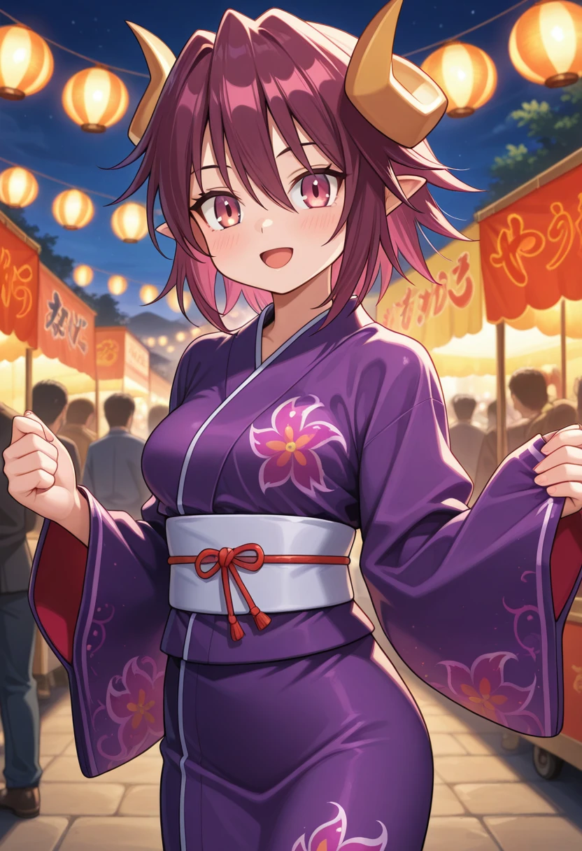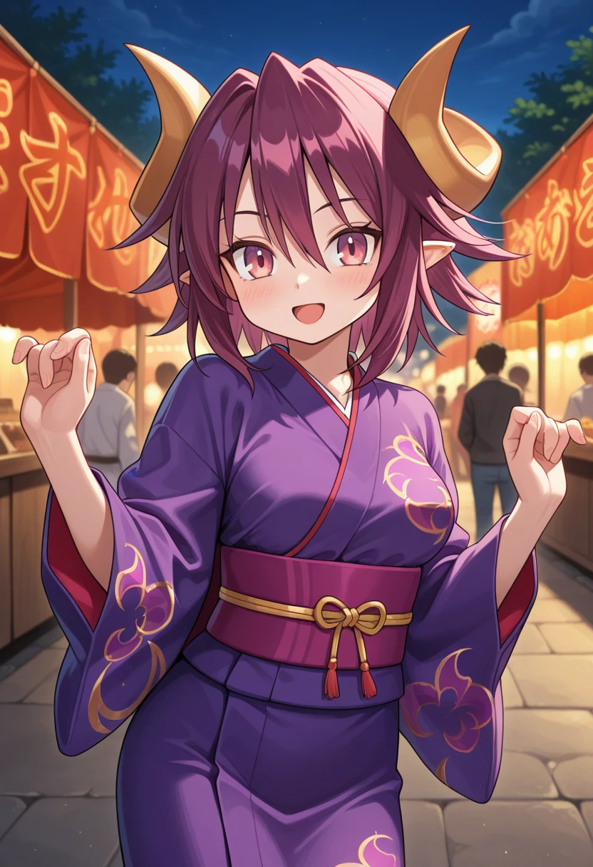shion_shinra, purple hair, short hair, purple eyes, horns, pointy ears