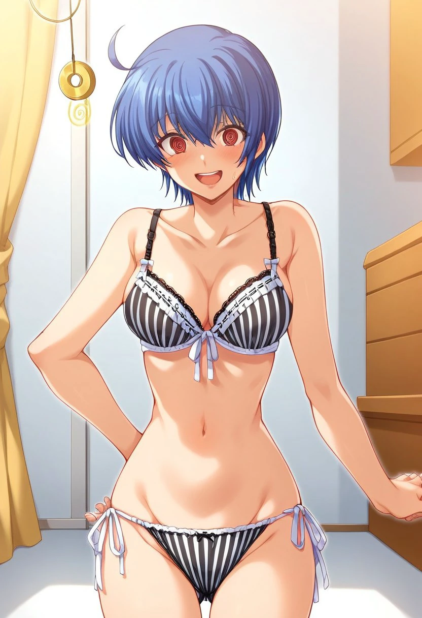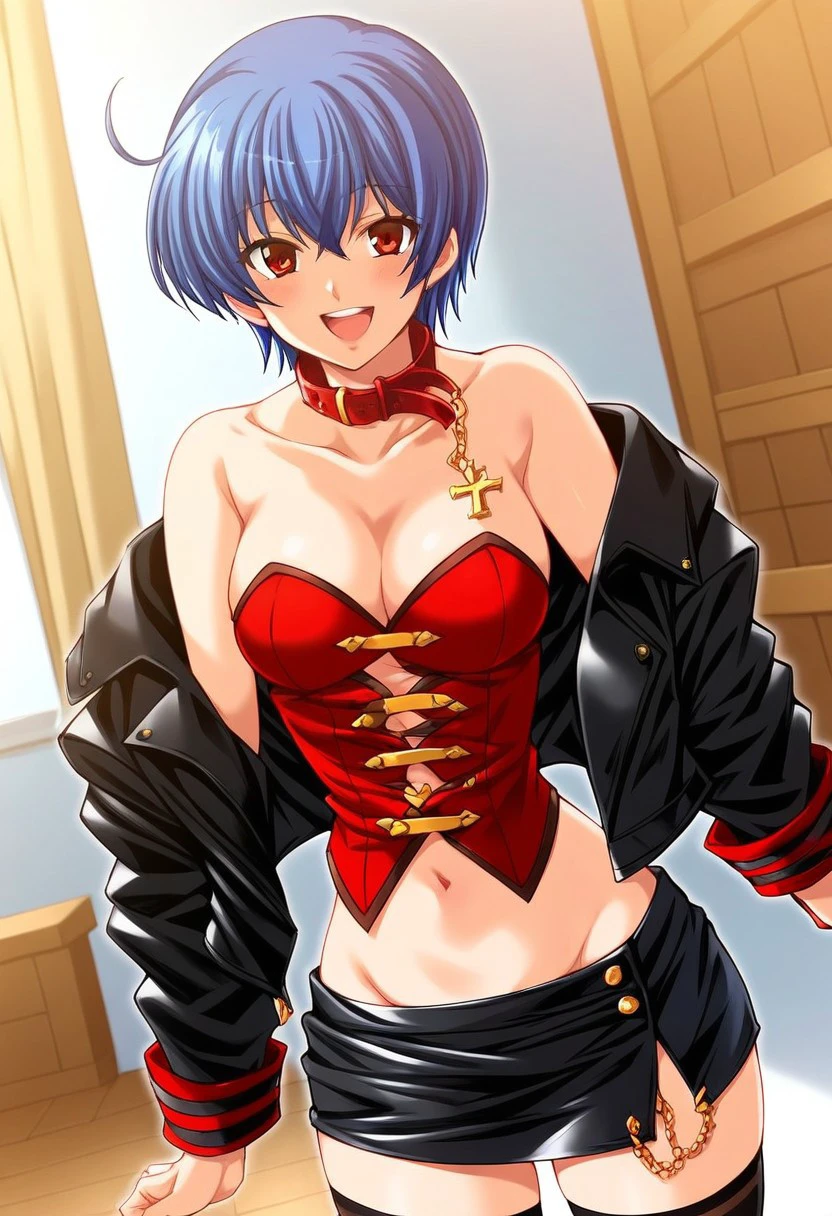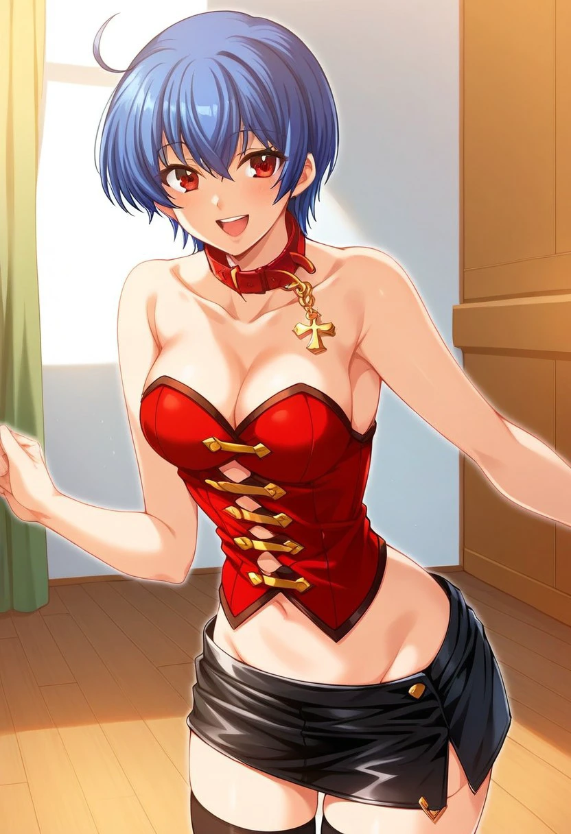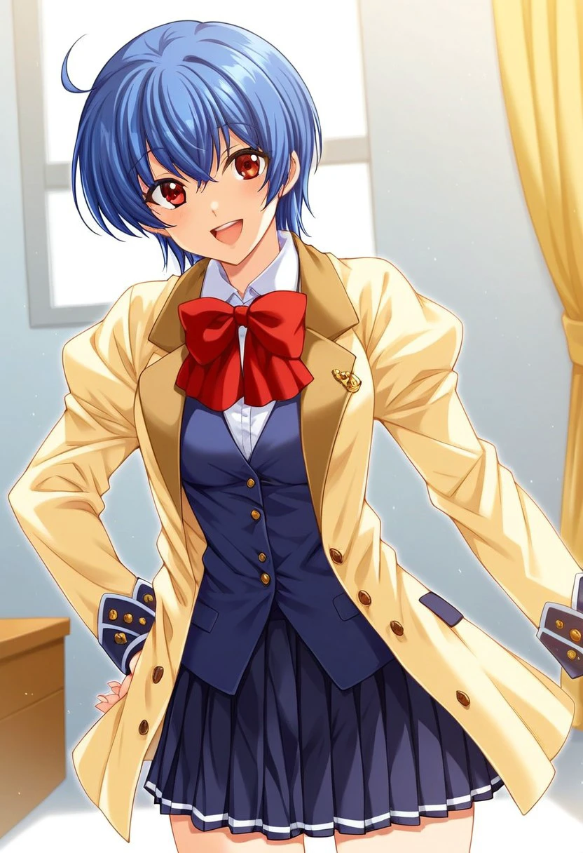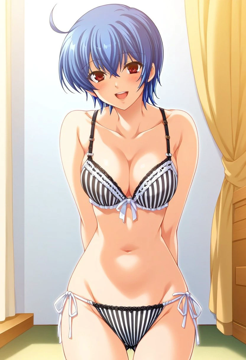 Ahoge, Blue hair, Short hair,Red eyes, Medium Breasts