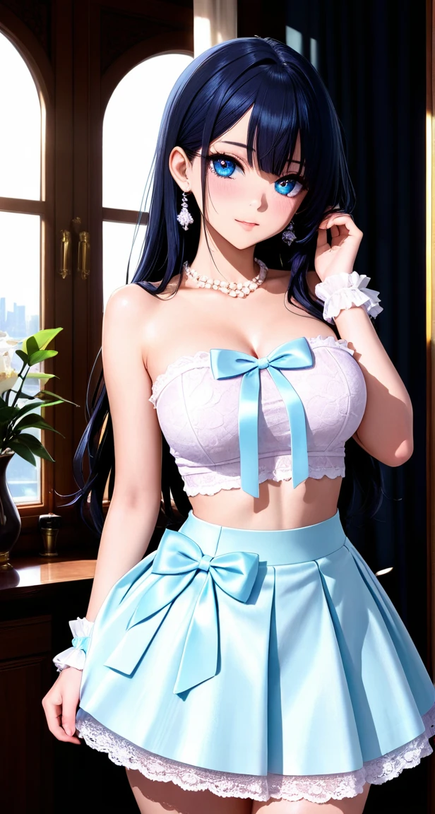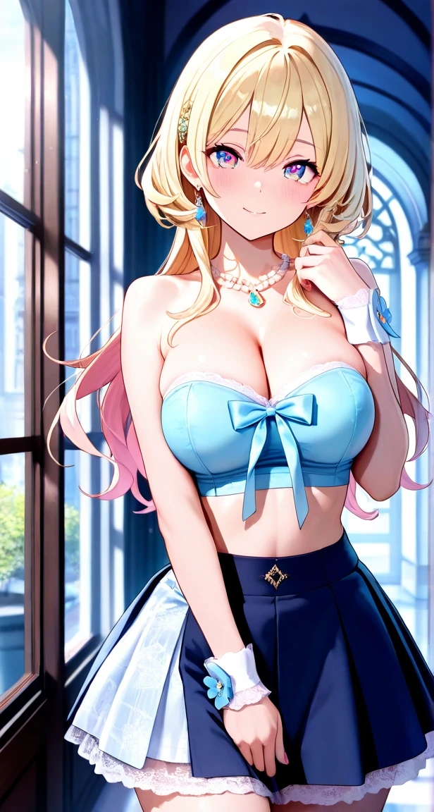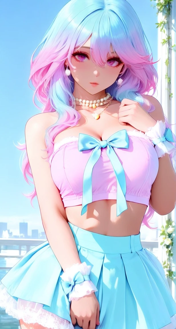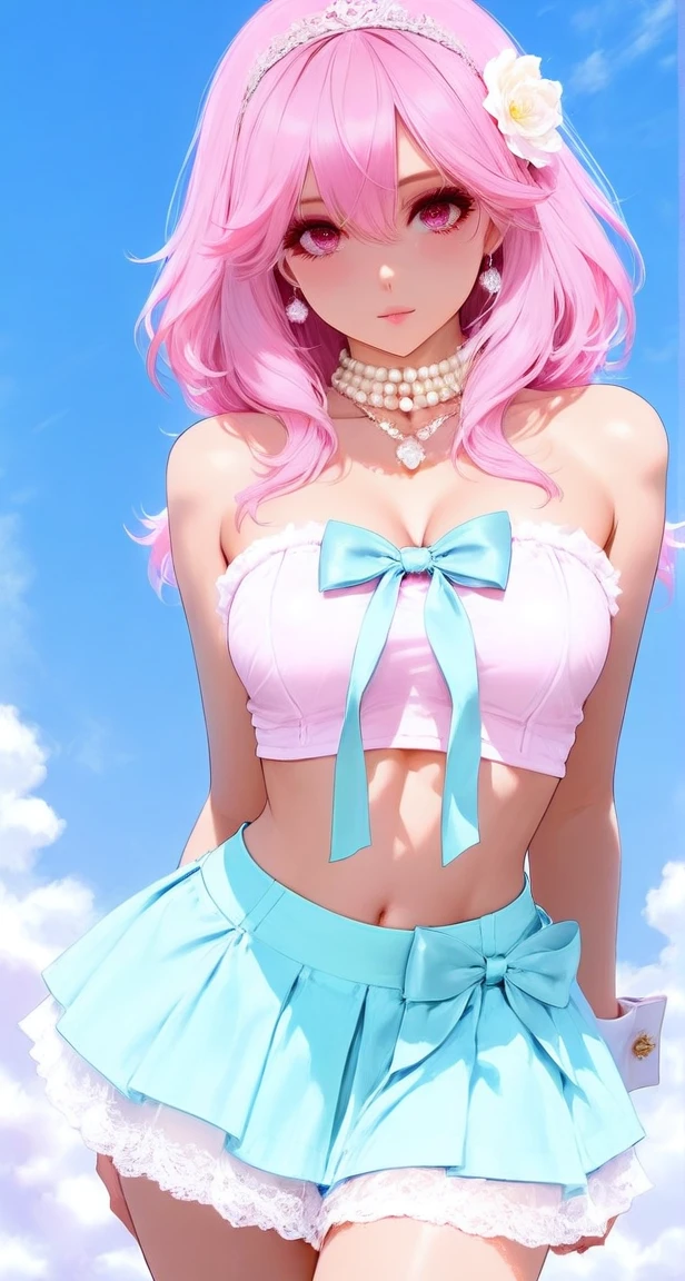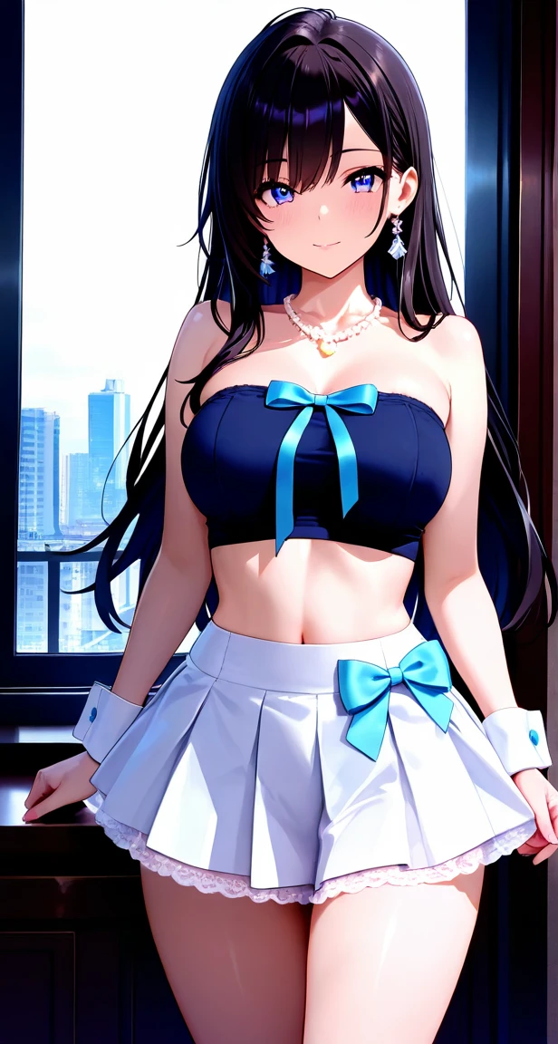 cute_and_sexy, skirt, strapless, tube top, jewelry, necklace, midriff, wrist cuffs