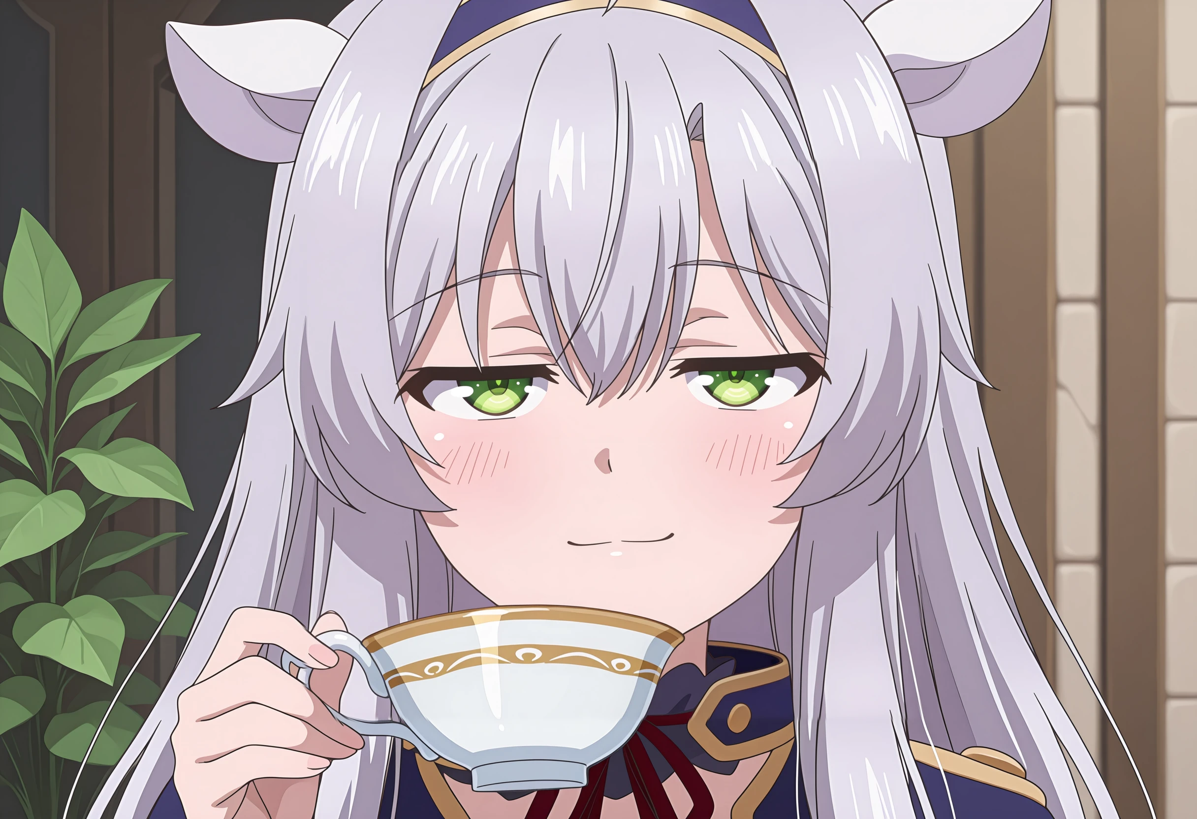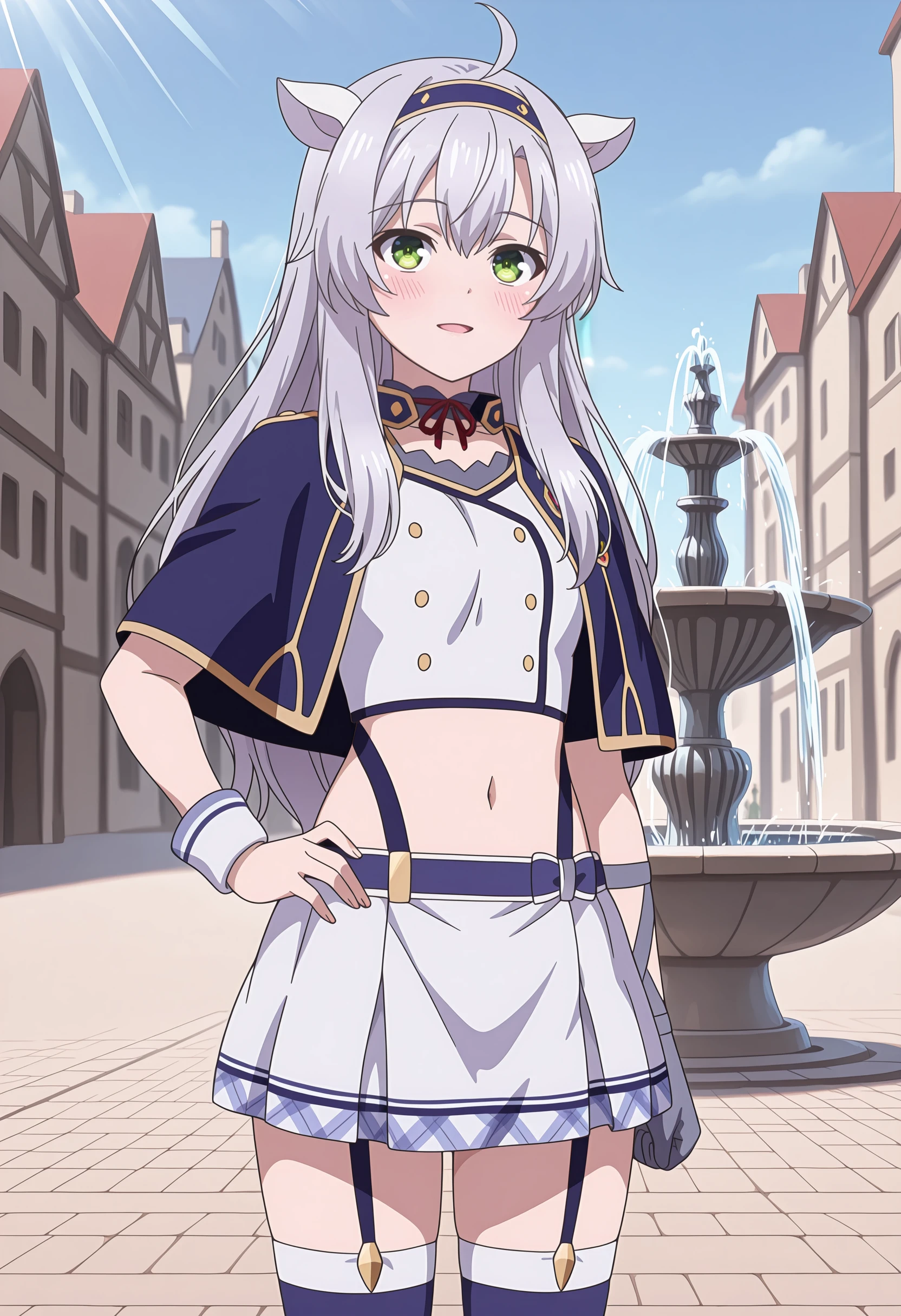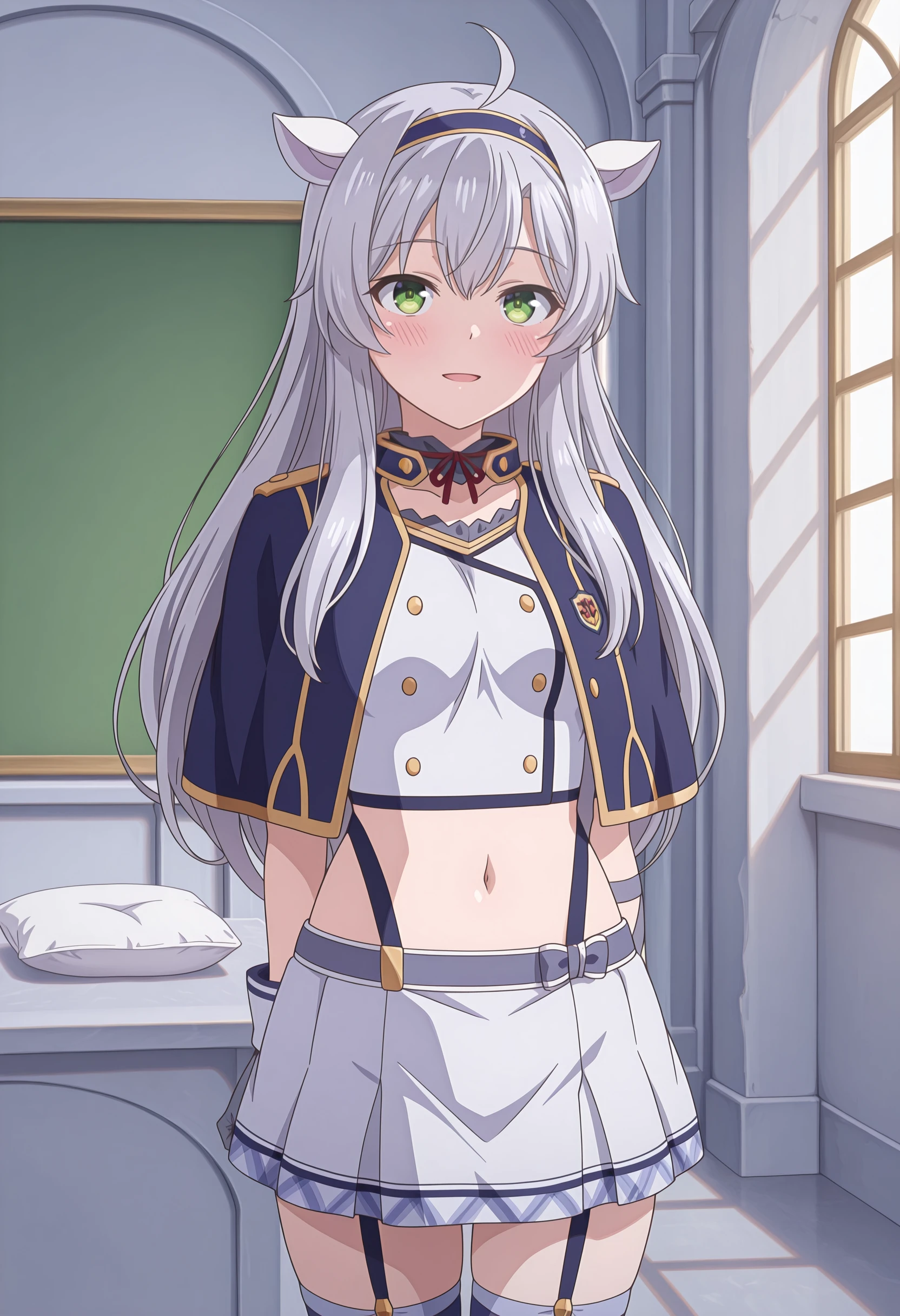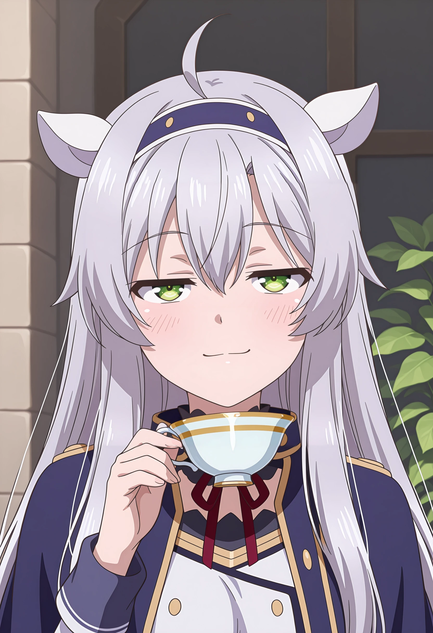 1girl, solo, long hair, ahoge, grey hair, green eyes, fake animal ears, blue hairband