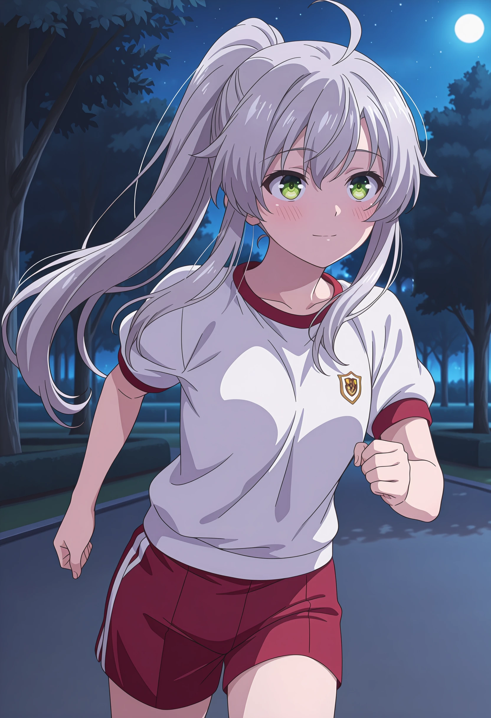 gym clothes, white shirt, red shorts