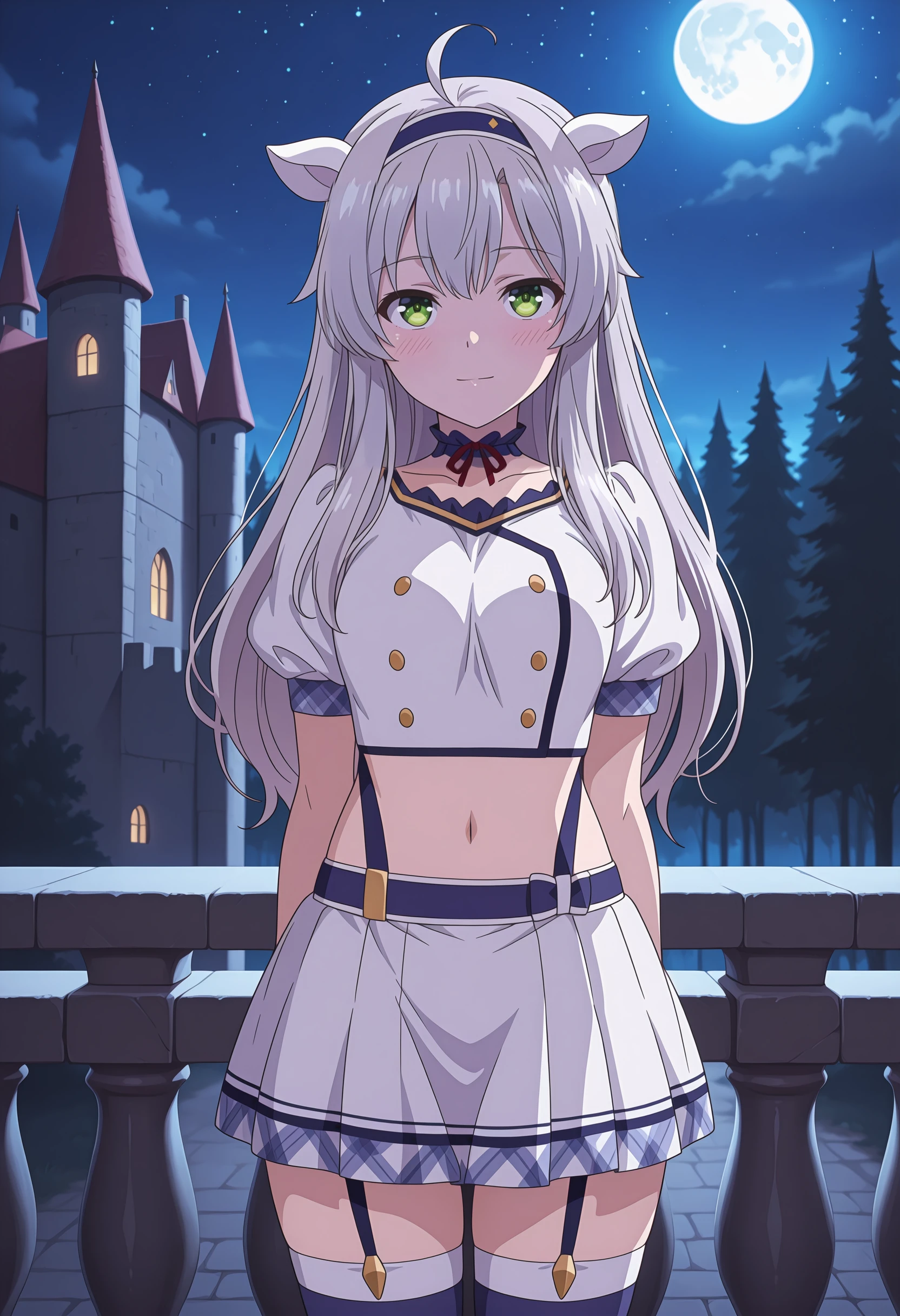 blue choker, red ribbon, white shirt, crop top, buttons, puffy short sleeves, navel, garter straps, white skirt, suspender skirt, pleated skirt, blue thighhighs