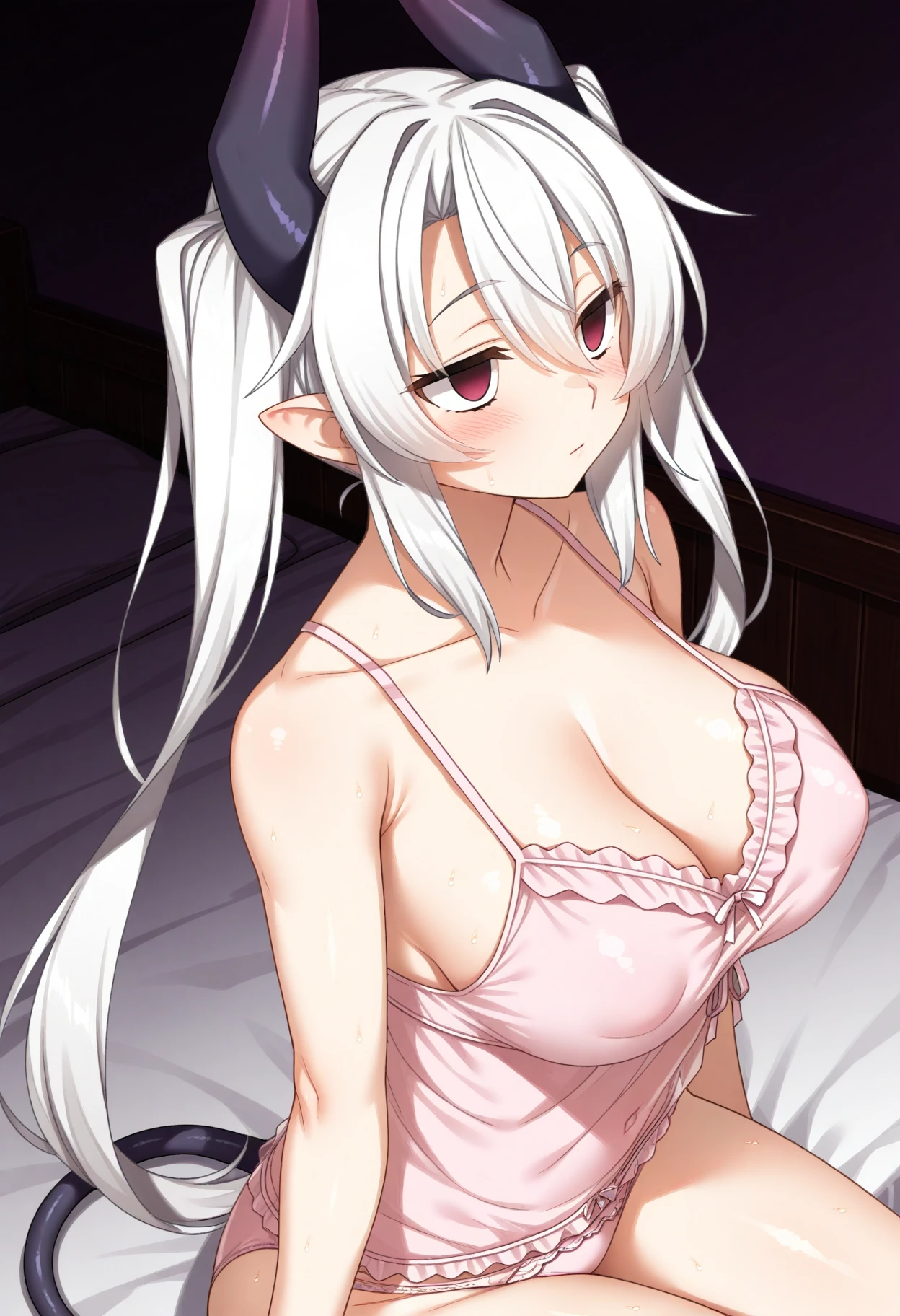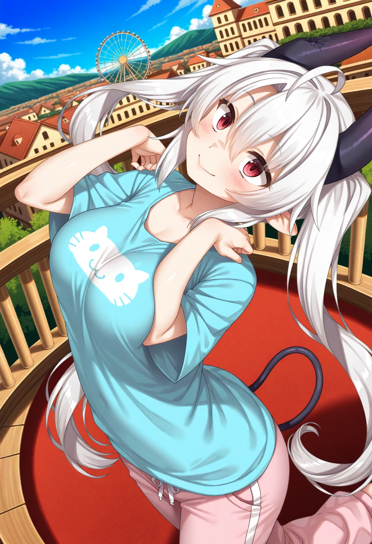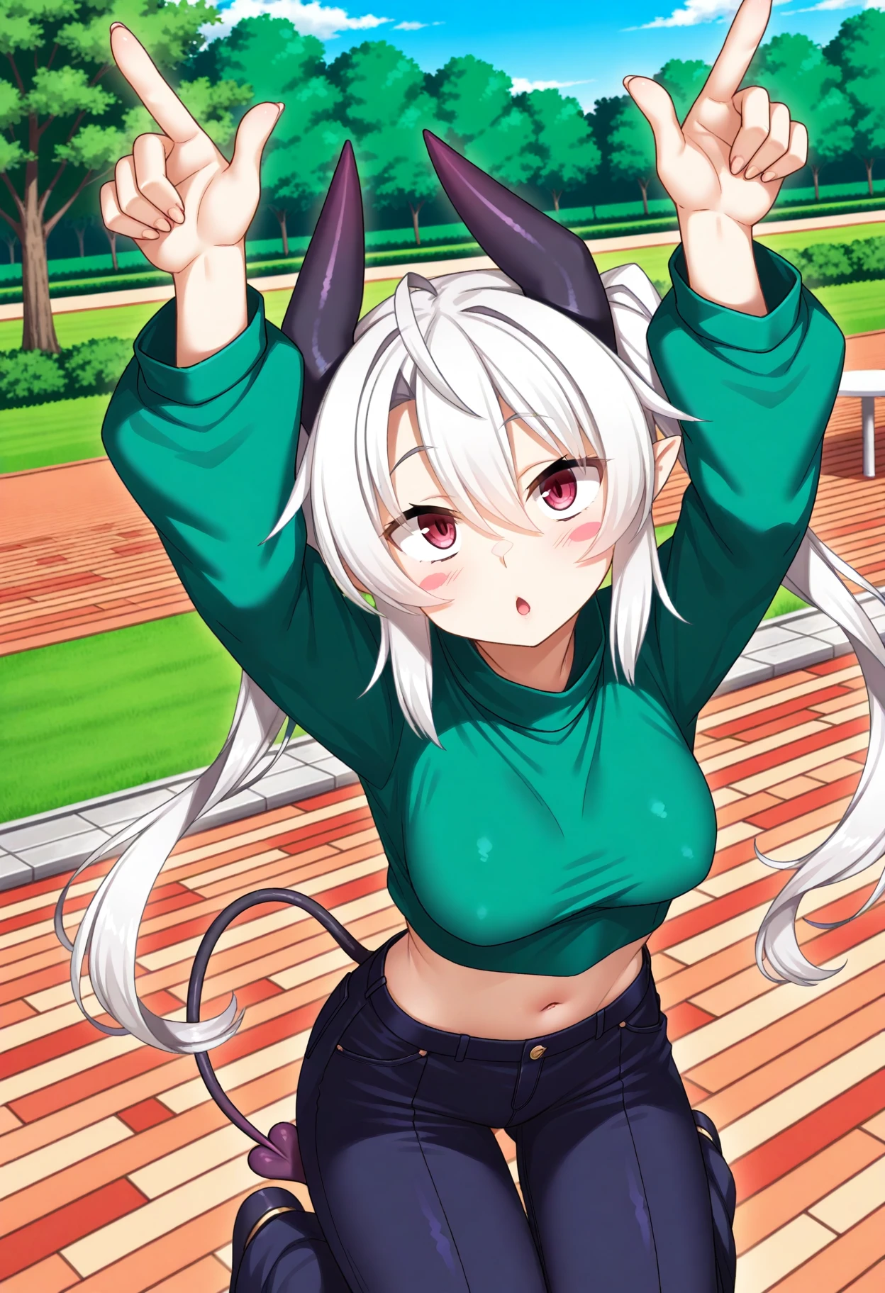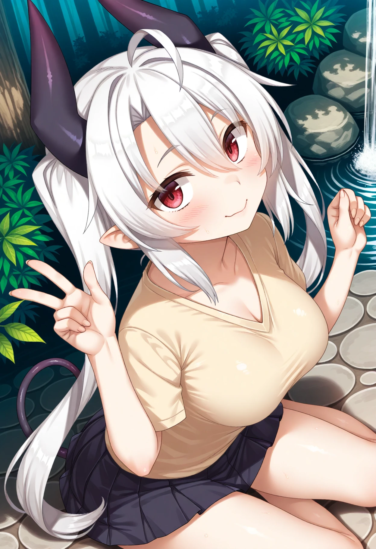 horns, white hair, twintails, hair between eyes, ahoge, sidelocks, red eyes, pointy ears, tail, fangYou can change her horns with: