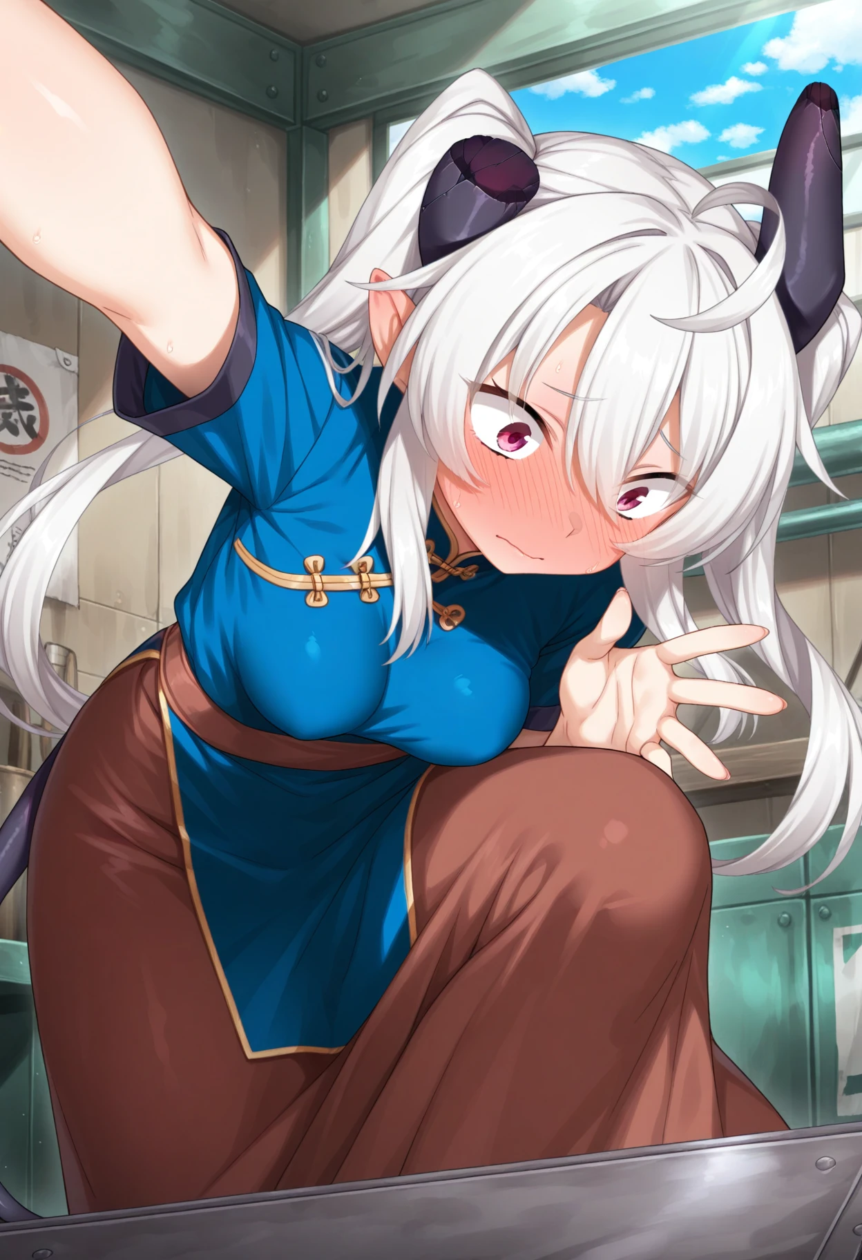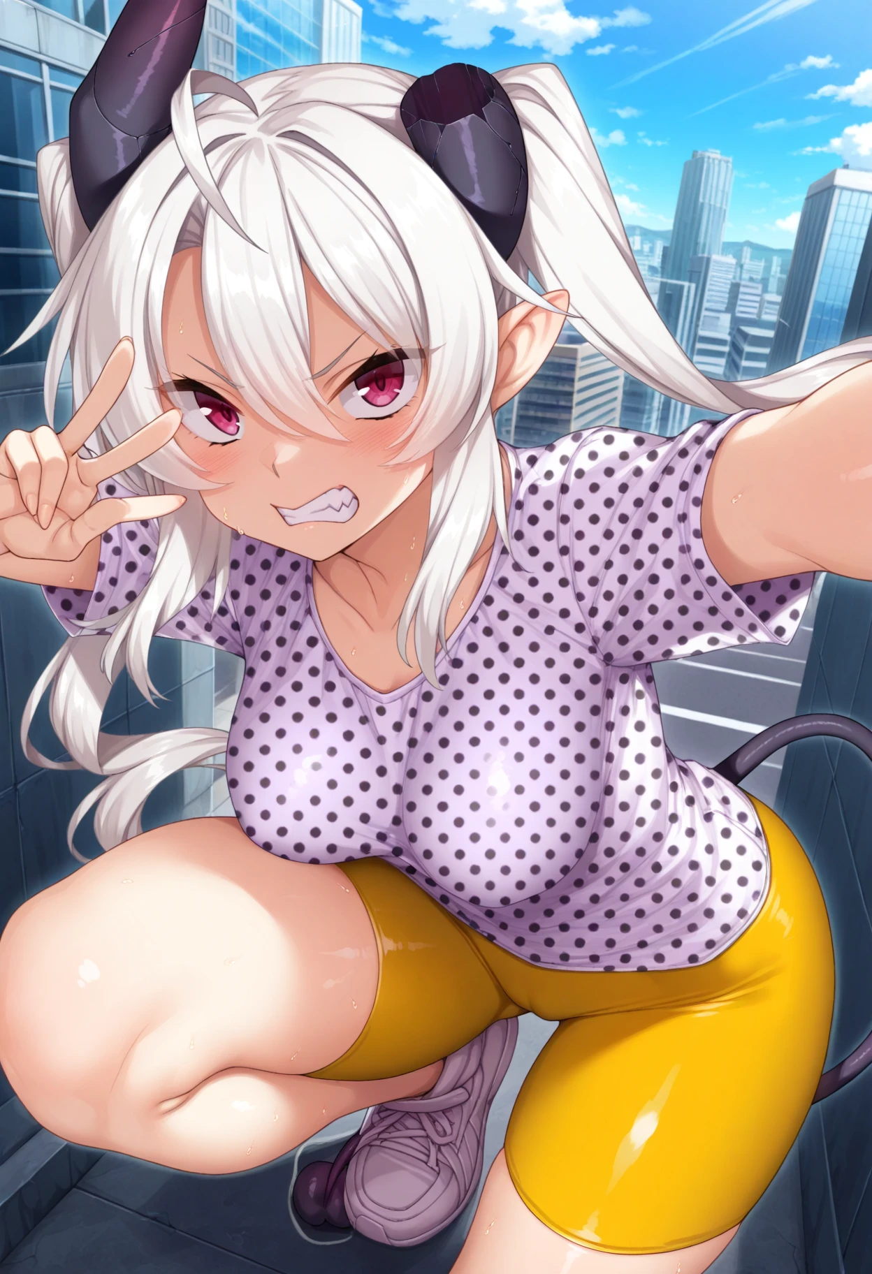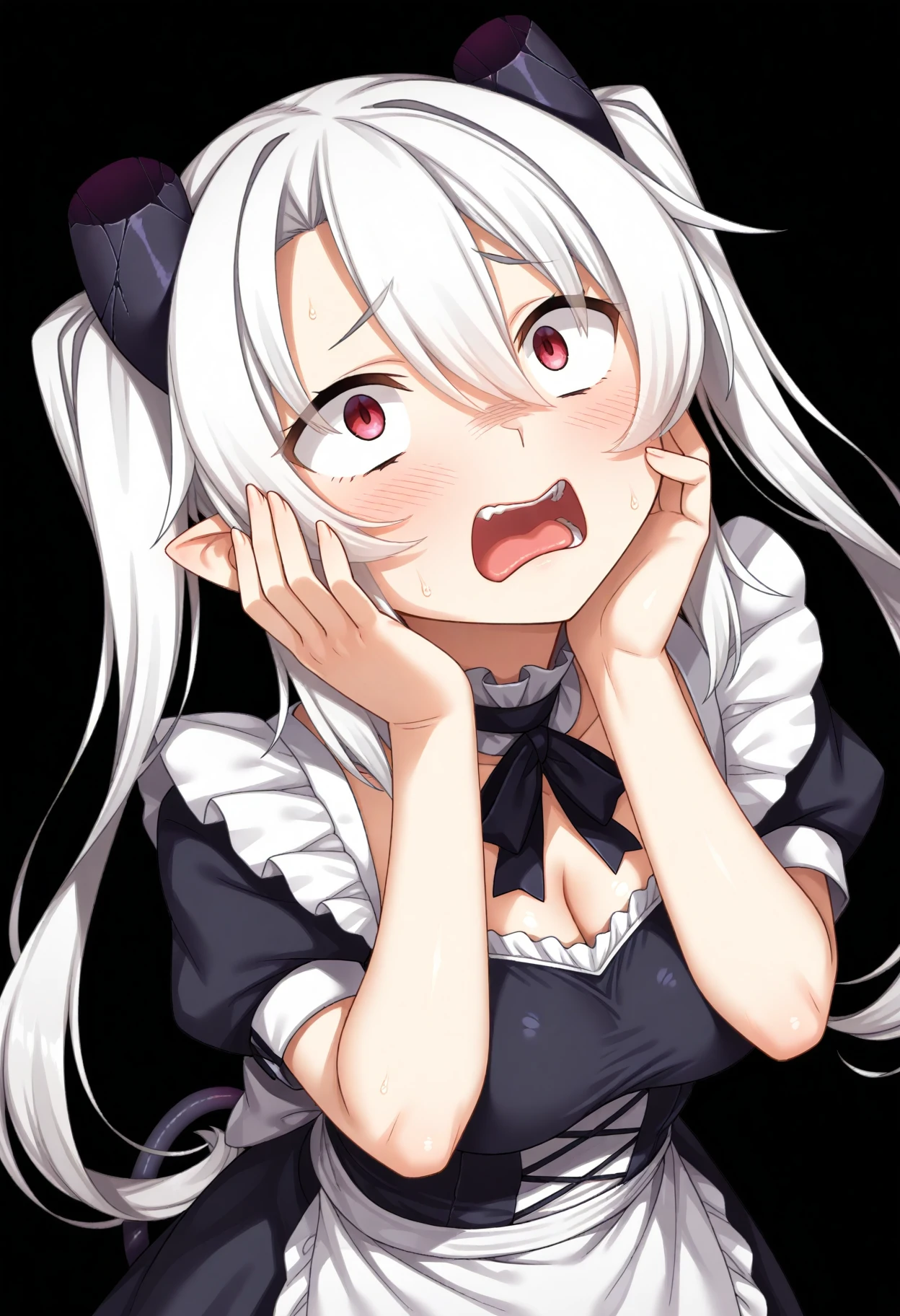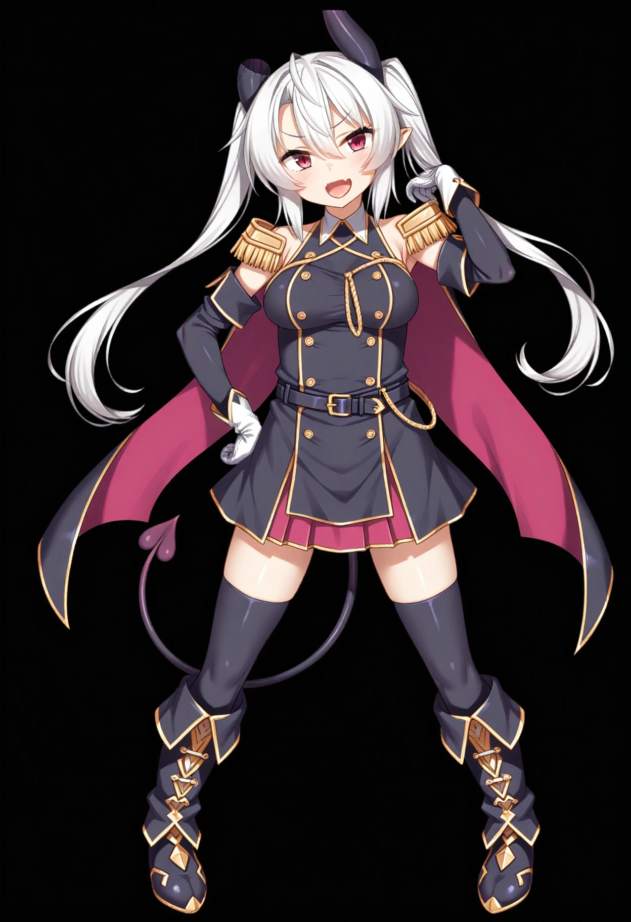 horns, white hair, twintails, hair between eyes, ahoge, sidelocks, red eyes, pointy ears, tail, fangYou can change her horns with: