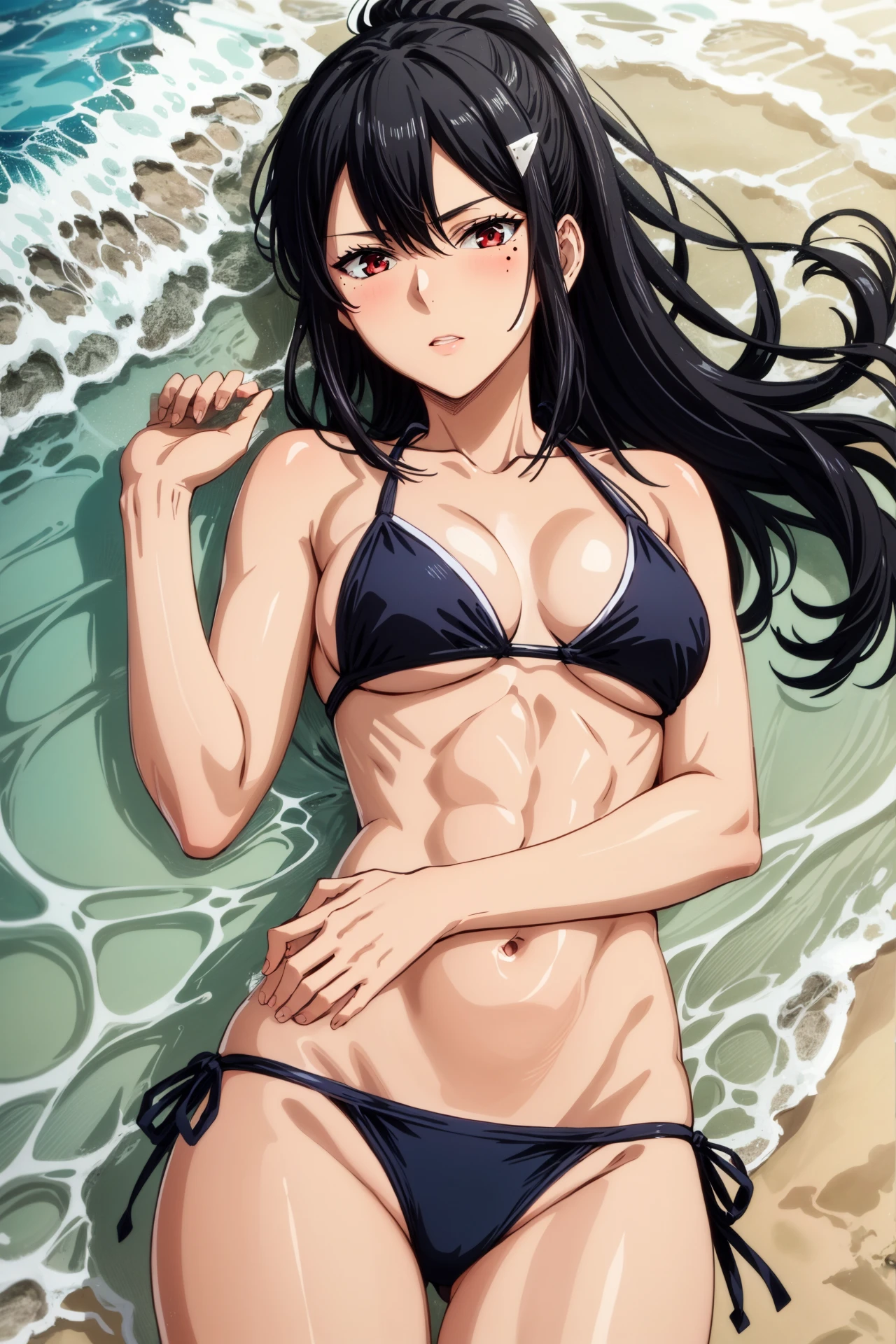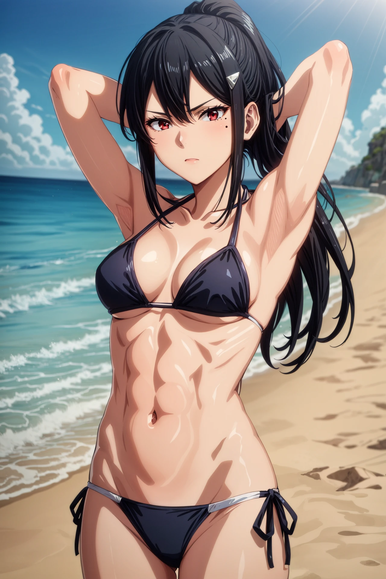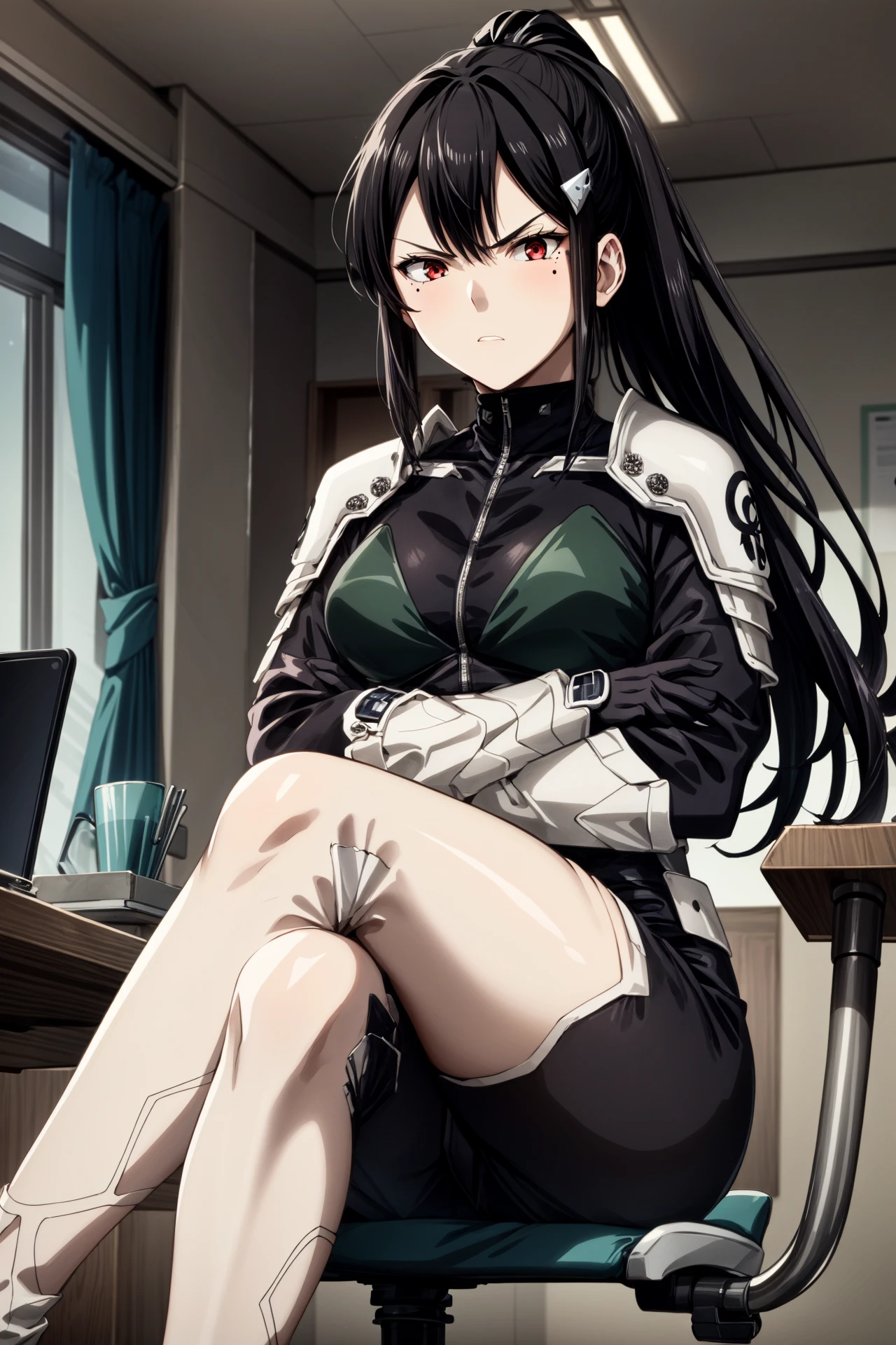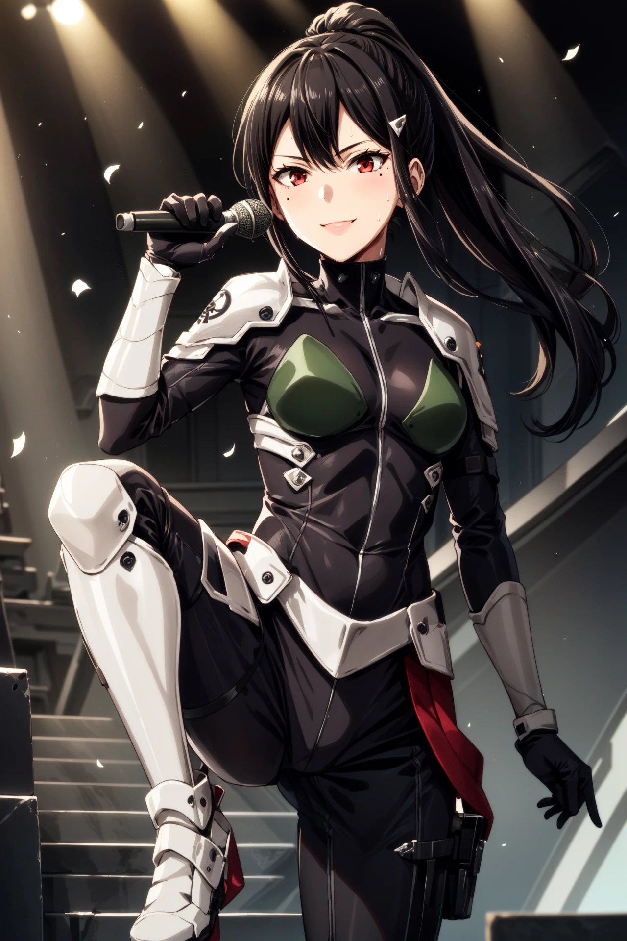 ashiro_mina_wz, black hair, straight hair, sidelocks, hairclip, ponytail, bronw eyes, mole under eye, bodysuit, armor, shoulder pads, breasts, black gloves, shoulder armor