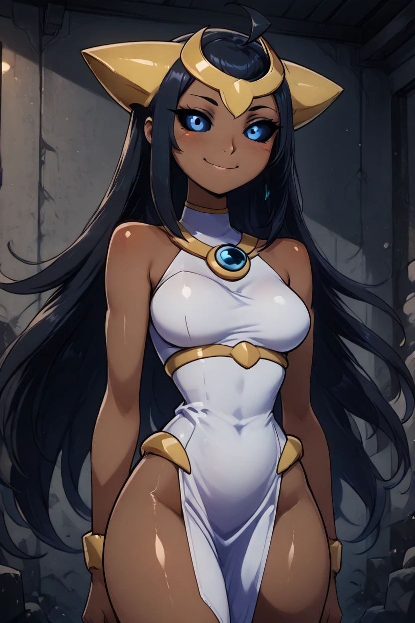 zzGilgiraCitronOC, ahoge, blue eyes, colored sclera, black sclera, black hair, long hair, dark skin, very long hair, white dress, bare shoulders, pelvic curtain, thighs