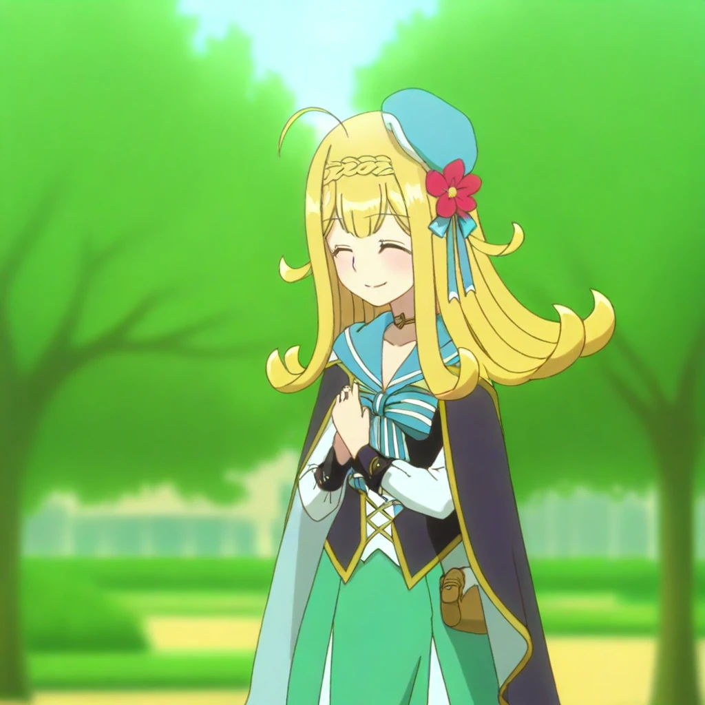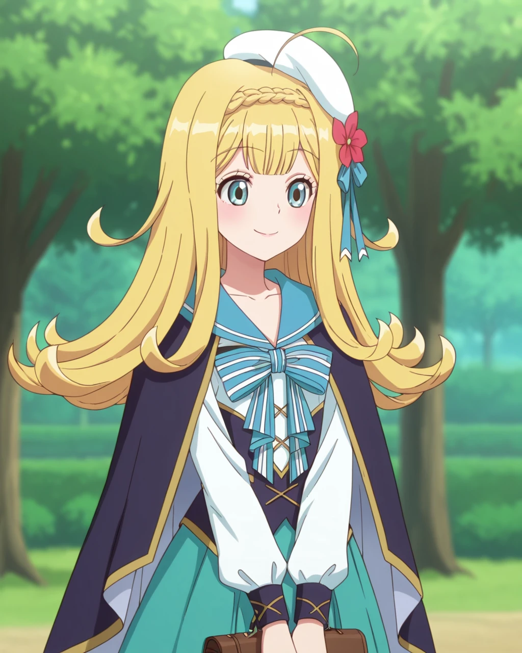Lieselotte Homuross, Lieselotte, long hair, 1girl, solo, white hat, ahoge, flower, smile, outdoors, tree, cape, braid, beret, bag, skirt, long sleeves, blurry, blurry background, green skirt, bow, closed mouth