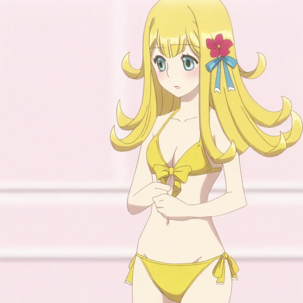 Lieselotte Homuross, Lieselotte, long hair, 1girl, solo, yellow bikini, cleavage, side-tie bikini bottom, ribbon, full body
