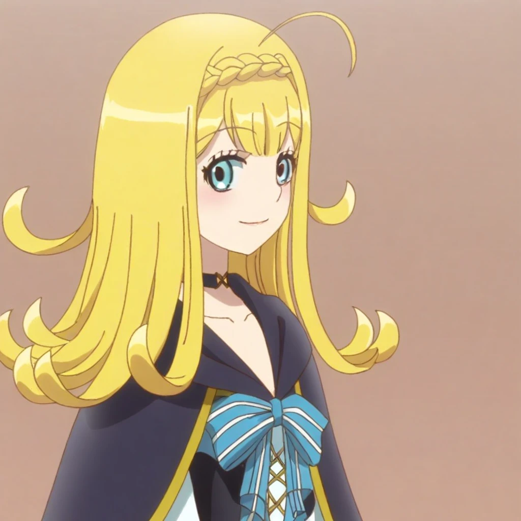 Lieselotte Homuross, Lieselotte, long hair, 1girl, solo, smile, ahoge, braid, choker, looking at viewer, upper body, crown braid, cloak, black choker, closed mouth