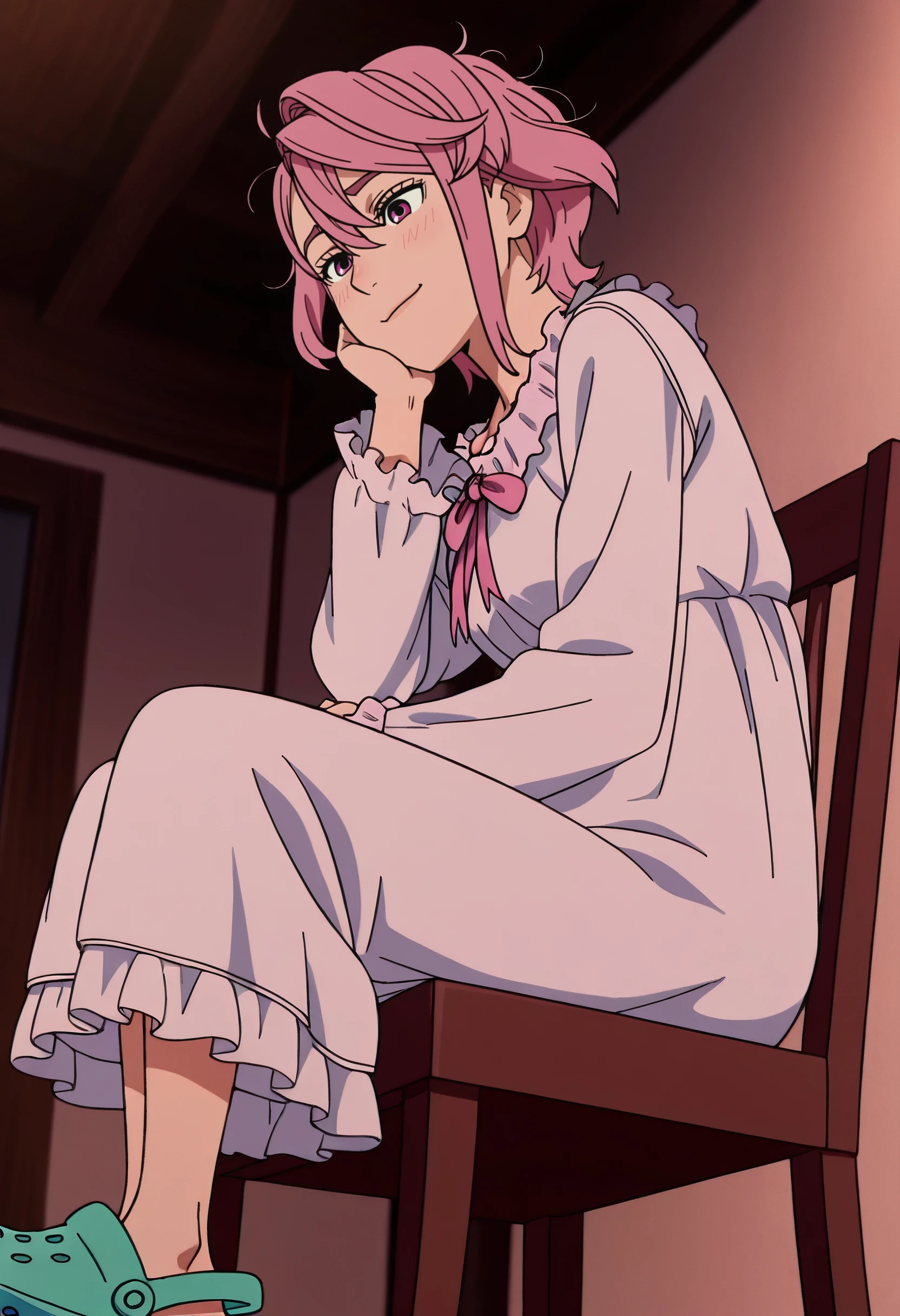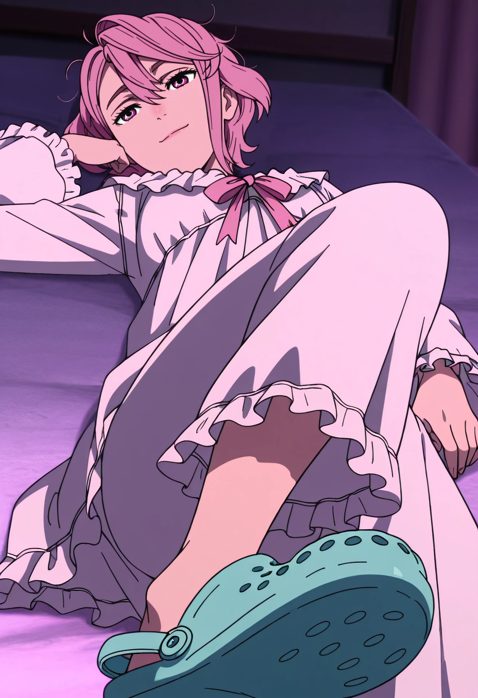 AiraSleepwear, long sleeves, pink bow, frills, nightgown, white dress, pink ribbon, crocs, blue footwear, white pajamas, messy hair, frilled sleeves,