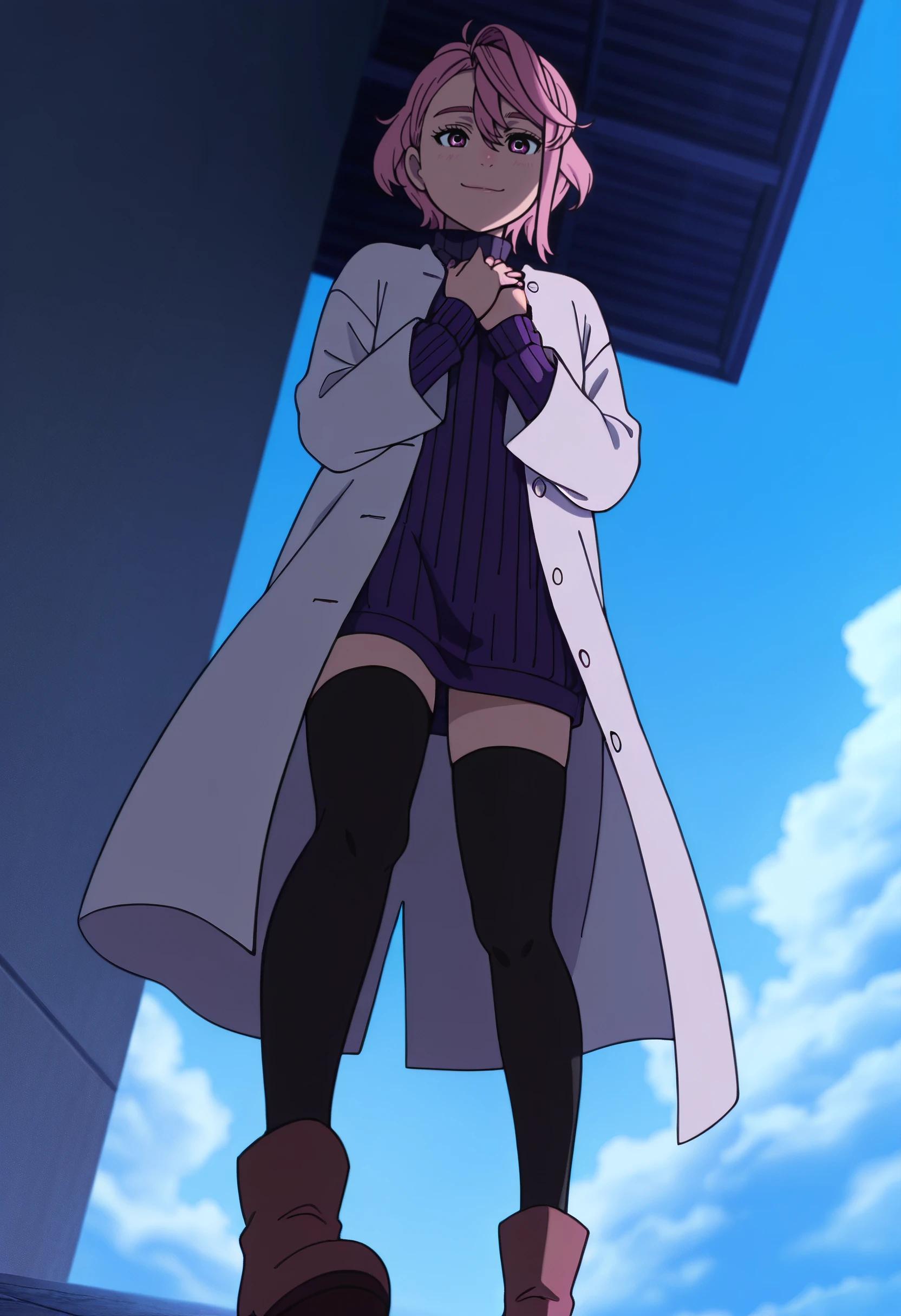 AiraSweaterC, purple sweater, long sleeves, white coat, turtleneck sweater, blue jacket, ribbed sweater, black thighhighs, open coat, sweater dress, lab coat, zettai ryouiki, shoes, boots, brown footwear,