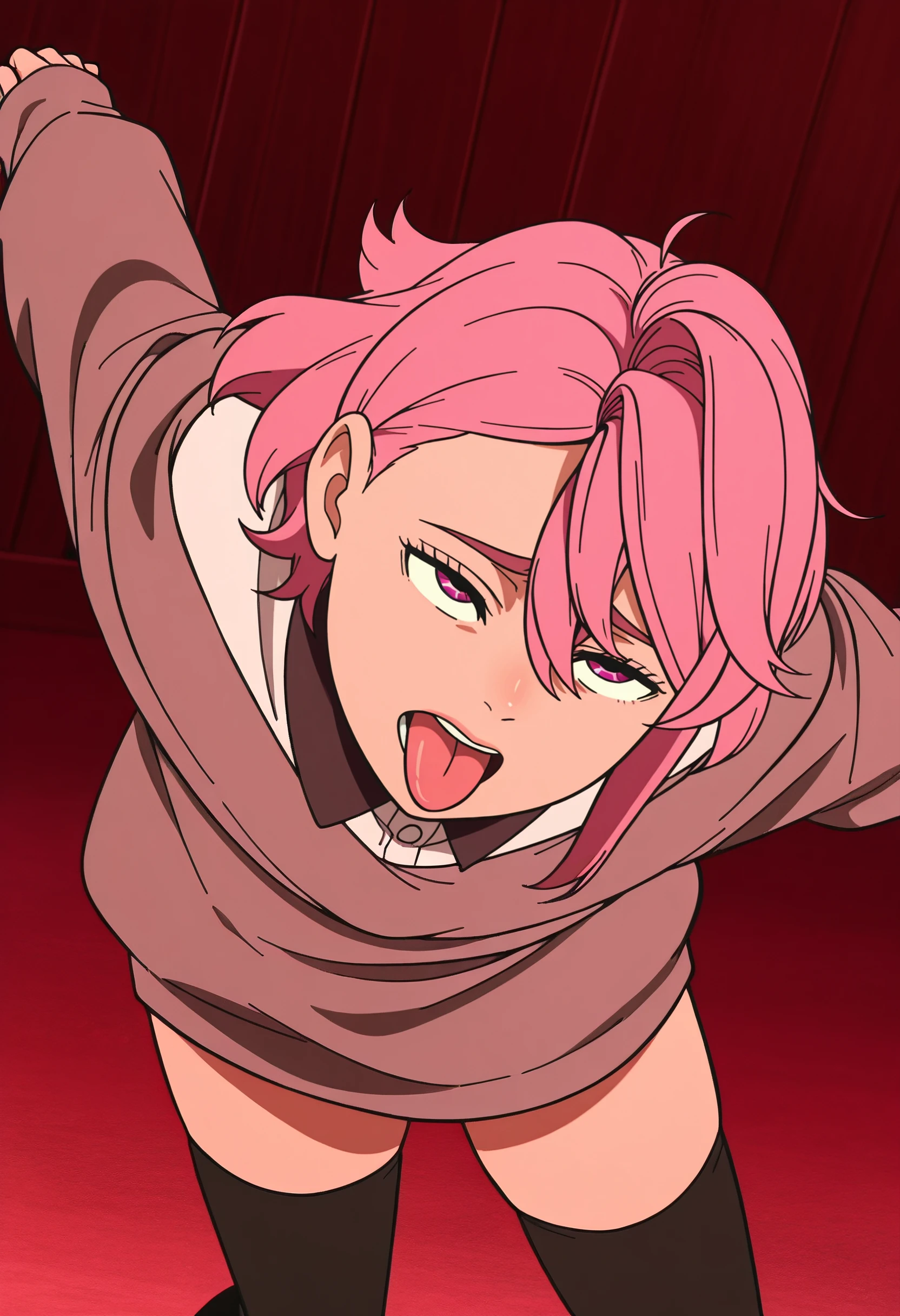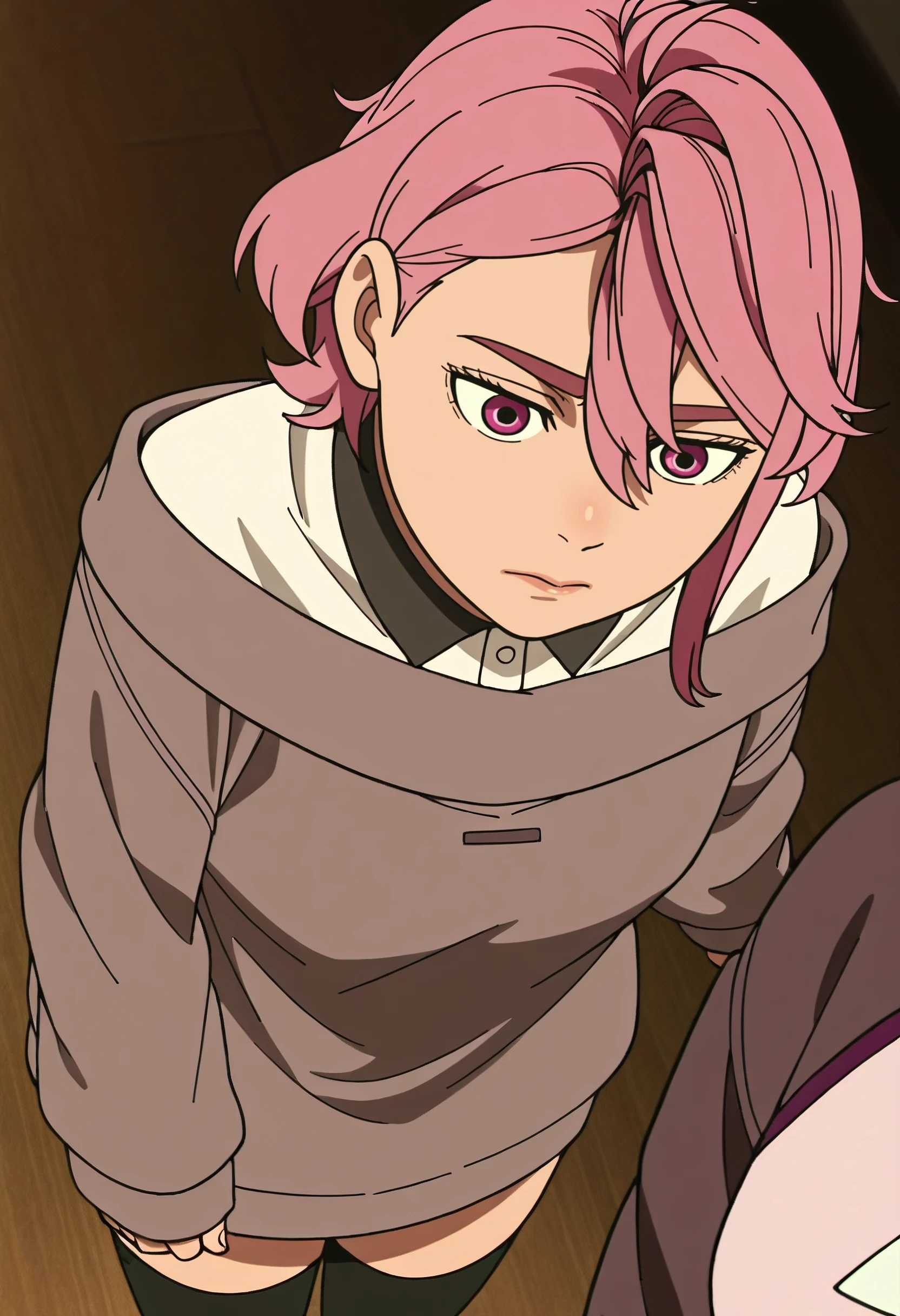 DanAira, pink hair, pink eyes, hair between eyes, short hair, asymmetrical hair,