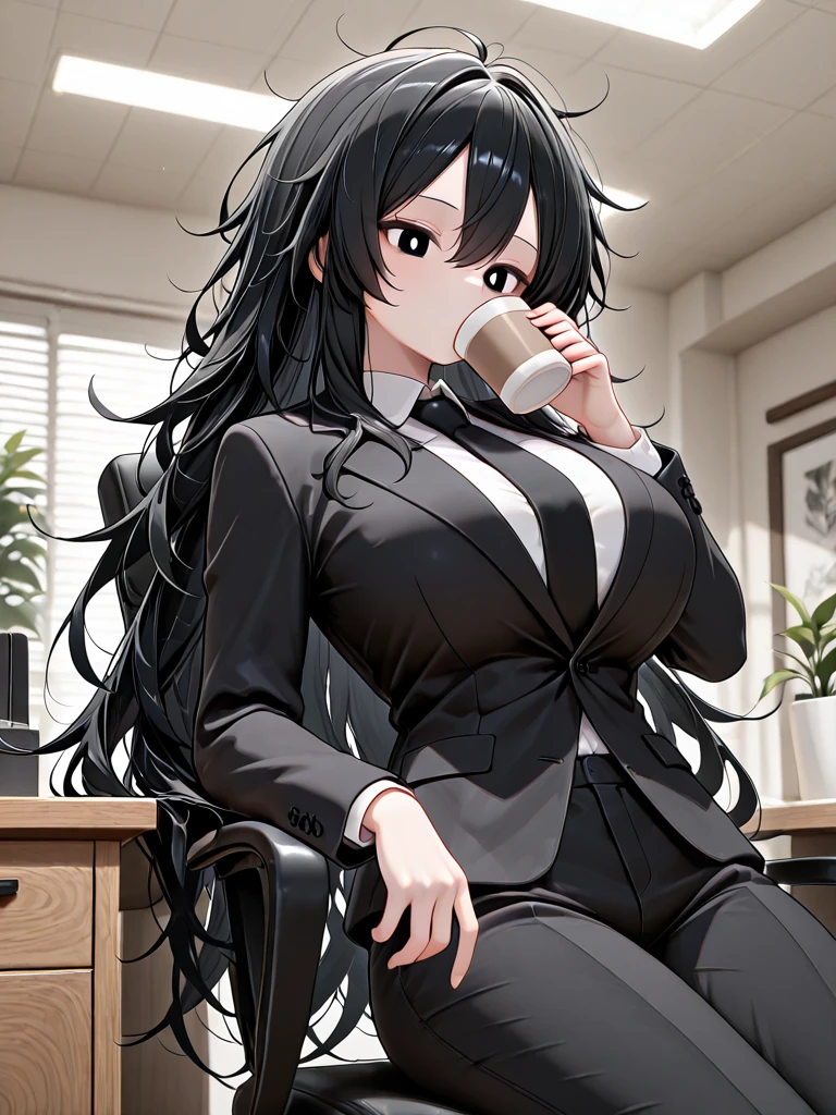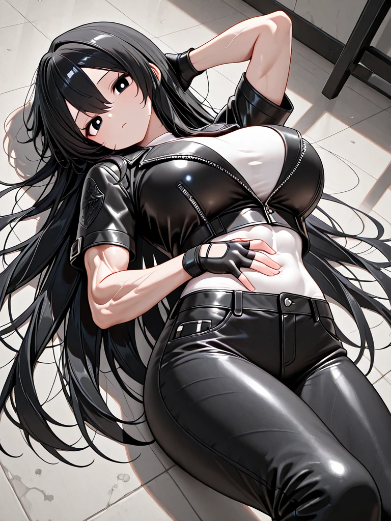 1girl,miyako kurose,black hair,super long hair,messy hair,hair between eyes,black eyes,white pupils,slender body,big breast,shredded muscle,slim arms,