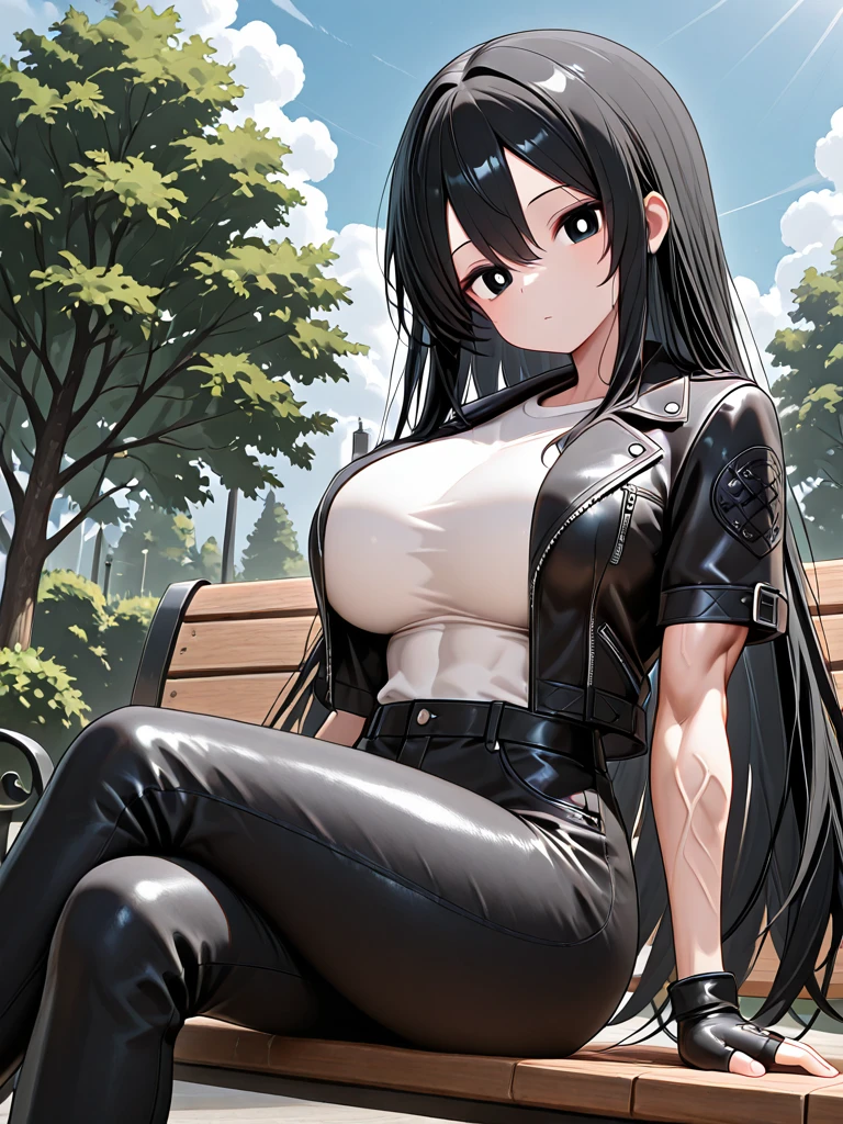 black leather jacket,short sleeves,white undershirt,black jeans,fingerless gloves,