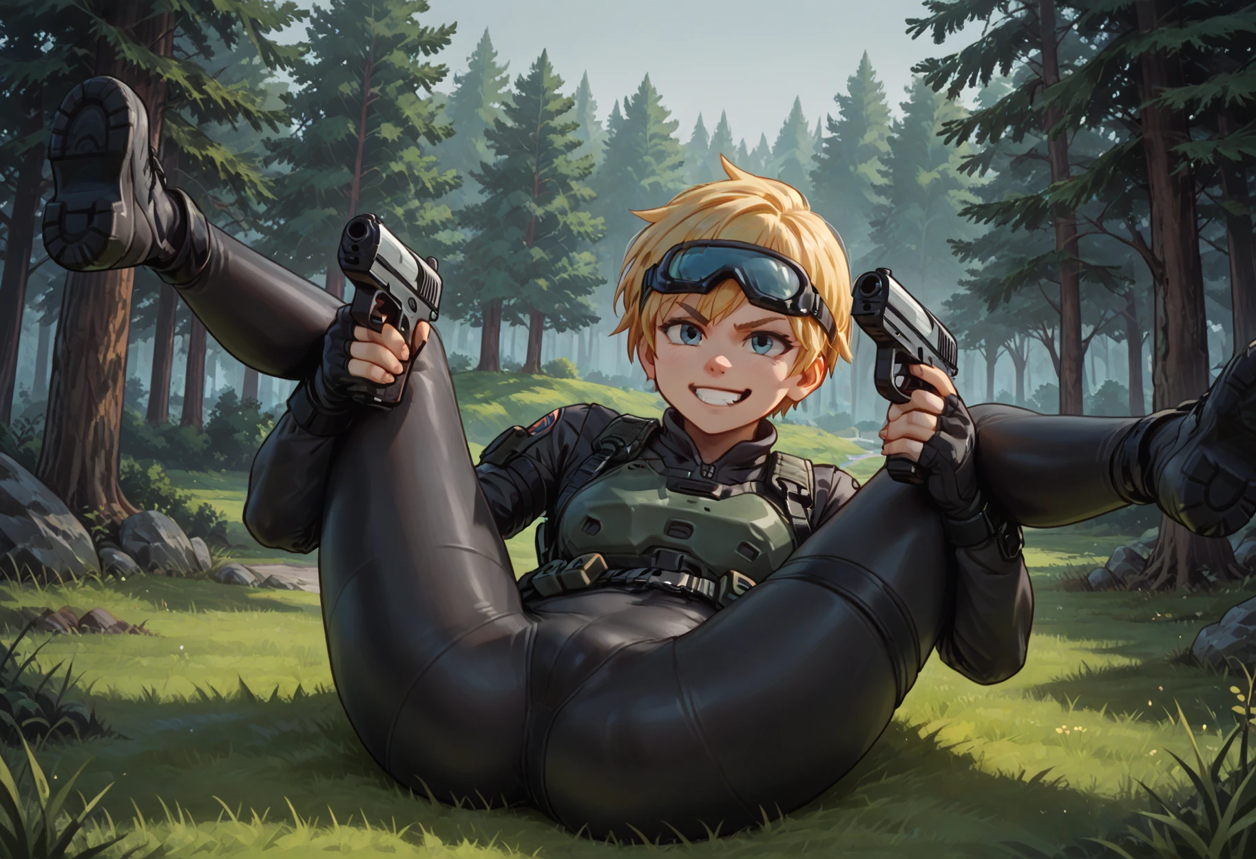 If you want objects in the character's hands, I recommend writing "holding weapons, handgun" into negatives. You can try to guess why.