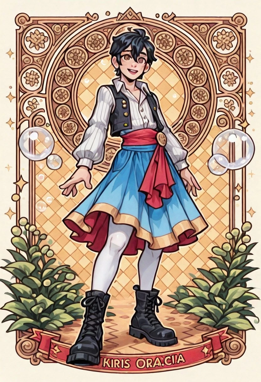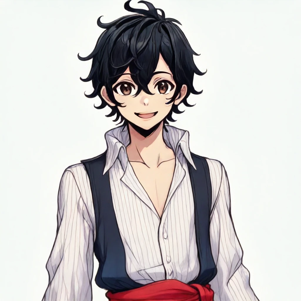 sirius draconea, 1boy, black hair, short hair, hair between eyes, pale skin, brown eyes, striped clothes, stripes, dress elements, skirt, blue skirt, red sarong, sash, t-shirt, striped shirt, open shirt, white shirt, vest, long sleeves, white pantyhose, black boots, footwear
