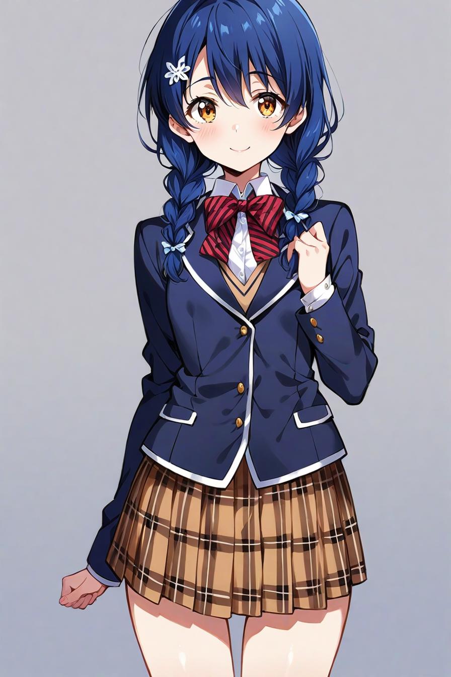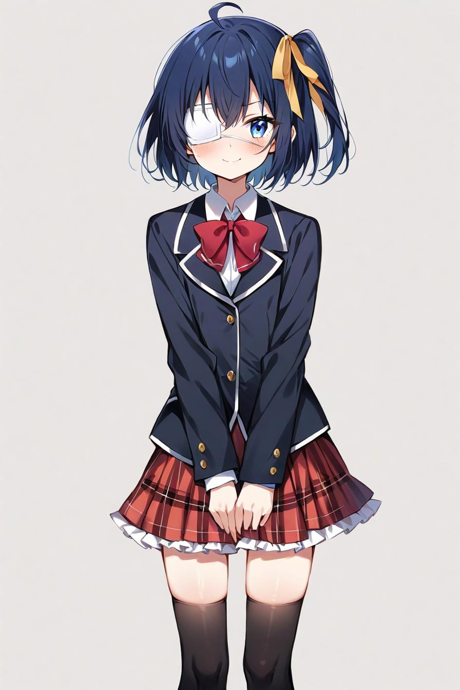 "1girl, yamada ryo, yellow eyes, short hair, hair over one eye, blue hair, mole under eye, eyes visible through hair, hairclip, shimokitazawa high school uniform, collared shirt, white shirt, long sleeves, black ribbon, blue skirt, pleated skirt, black pantyhose, fingernails"