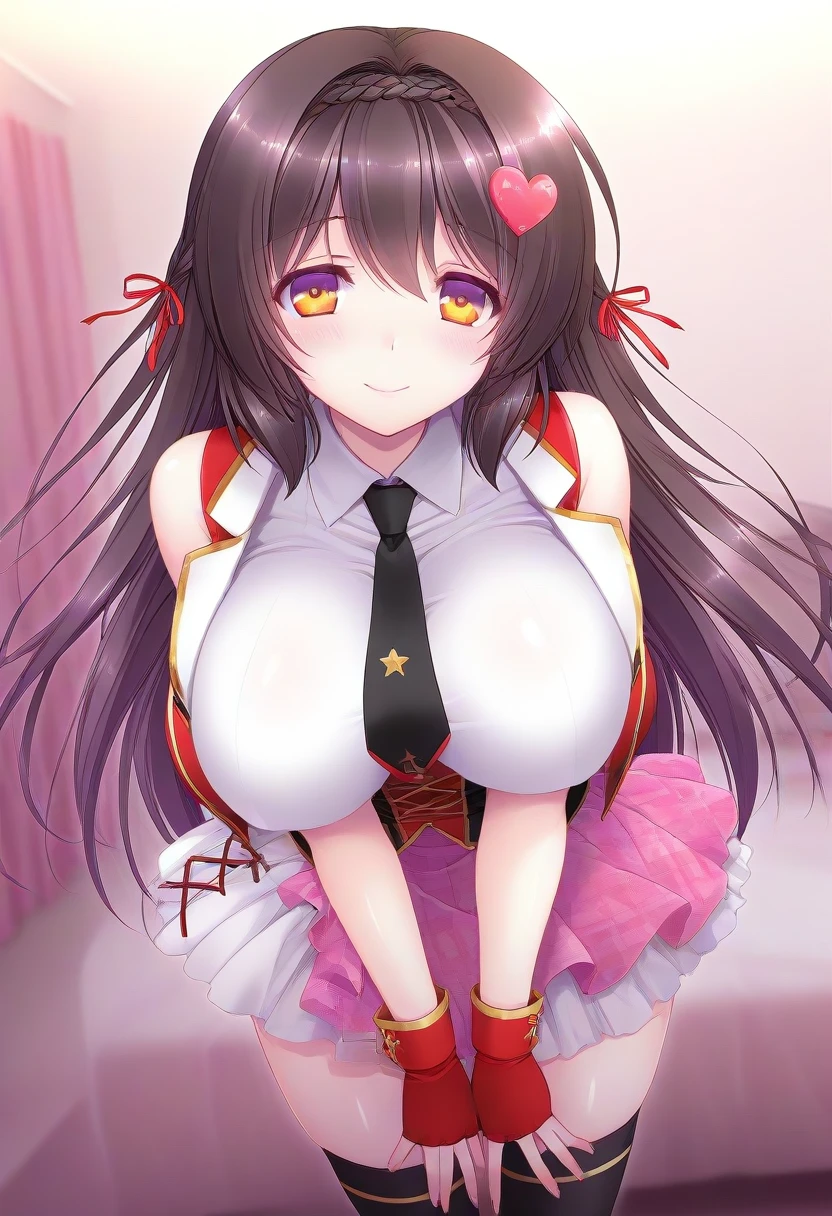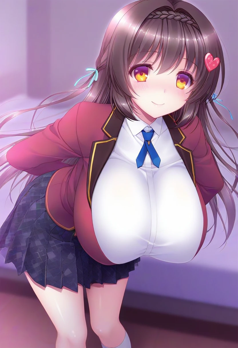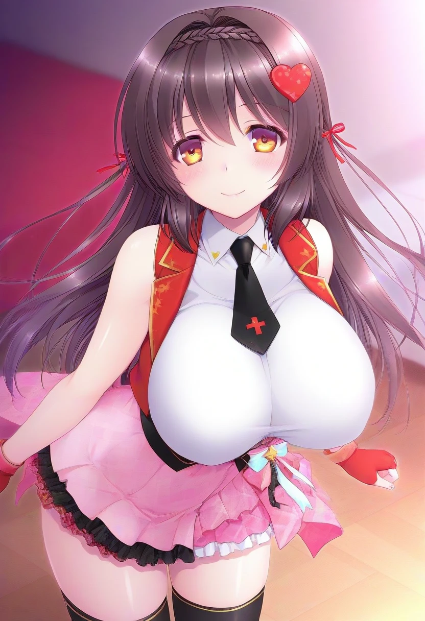 Recommend Prompt:Hotori Kisugi, amber eyes, brown hair, long hair, braided headband, heart hair ornament, hair ribbon,