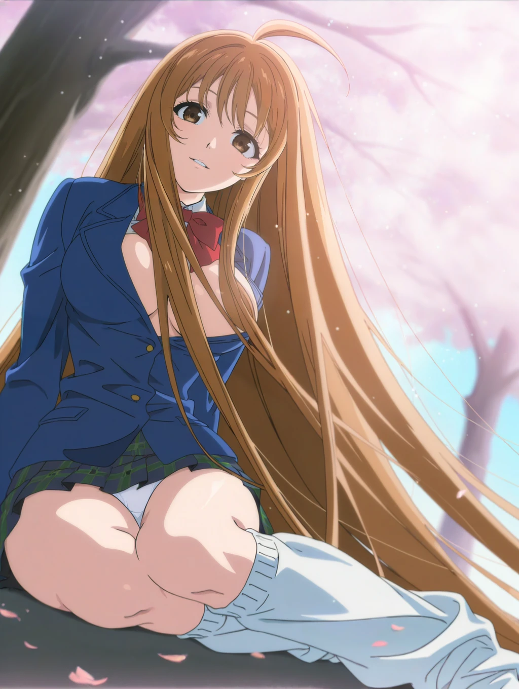 ayanatsume, natsume aya, brown hair, brown eyes, ahoge, very long hair, large breasts, school uniform, skirt, ,loose socks,blue blazer,