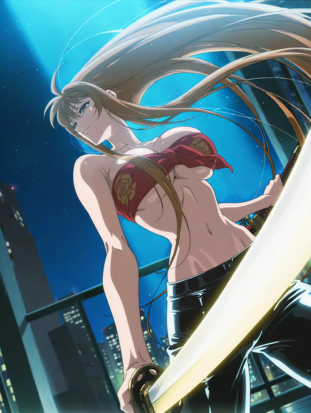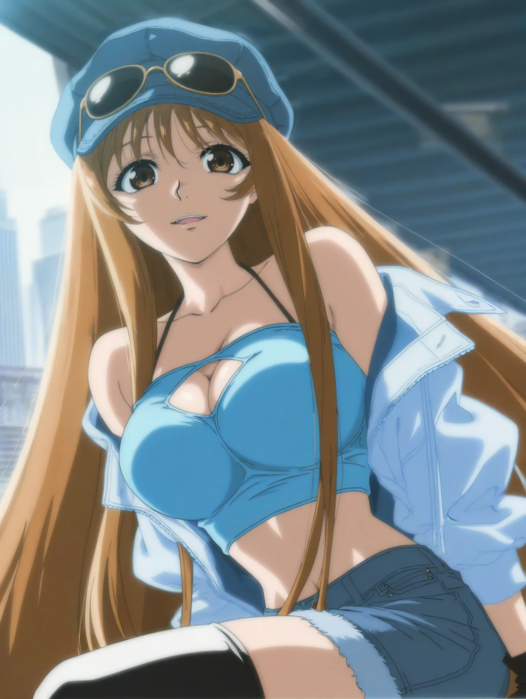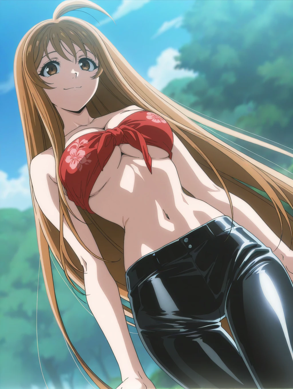 ayanatsume, brown hair, brown eyes, ahoge, very long hair, large breasts, red shirt ,bandeau, underclothes around breasts,underboob, bare sleeveless, cleavage, latex pants,midriff, brown shoes,high shoes