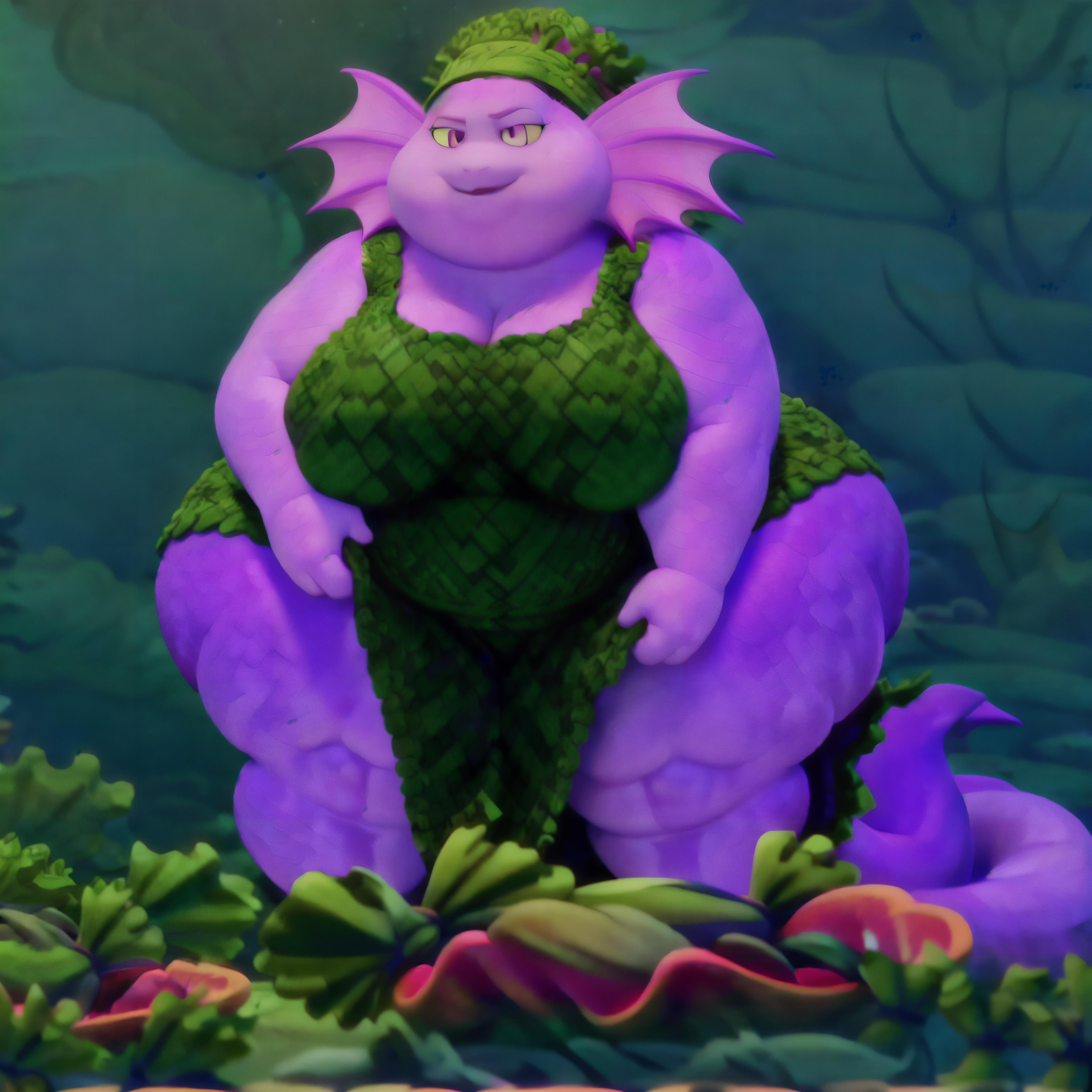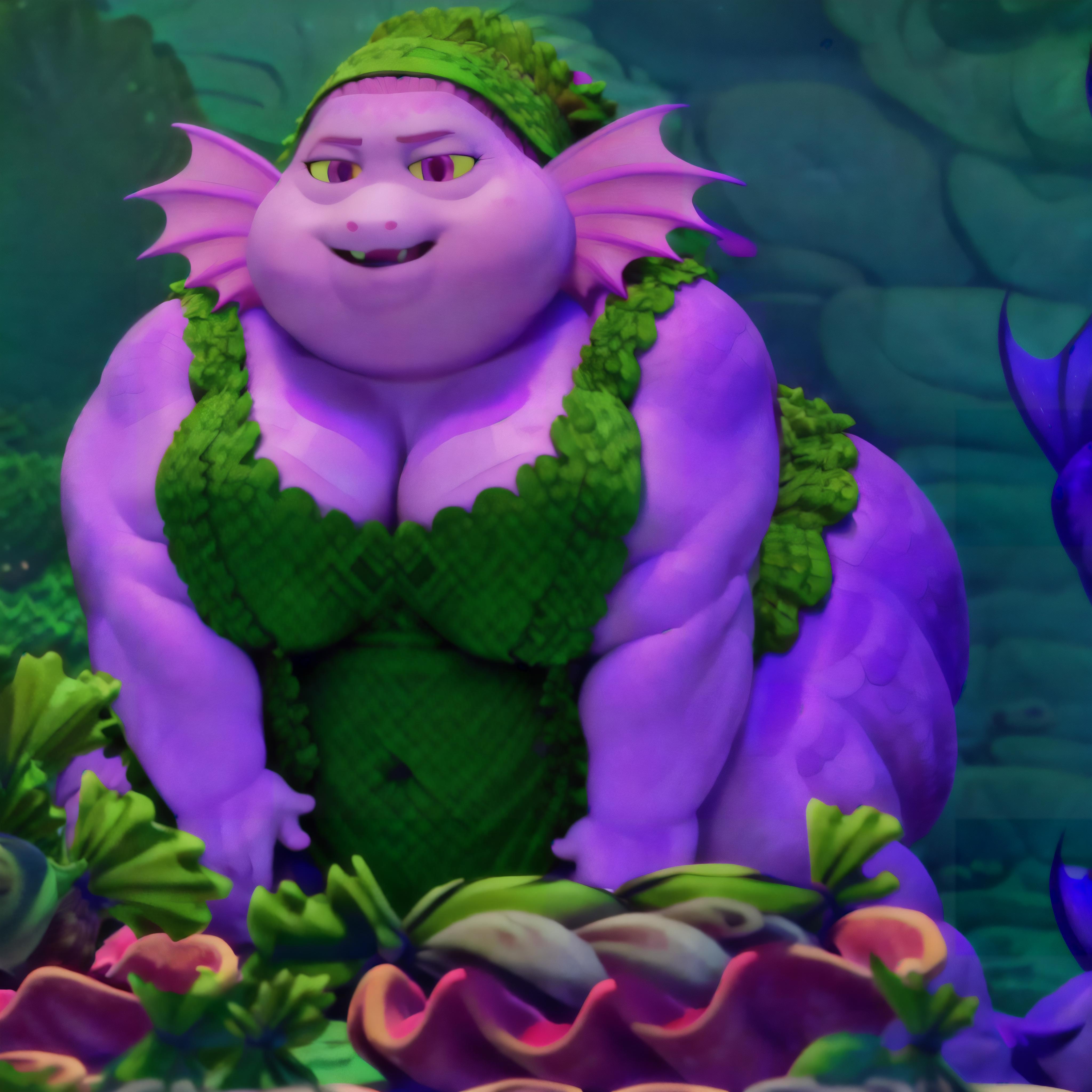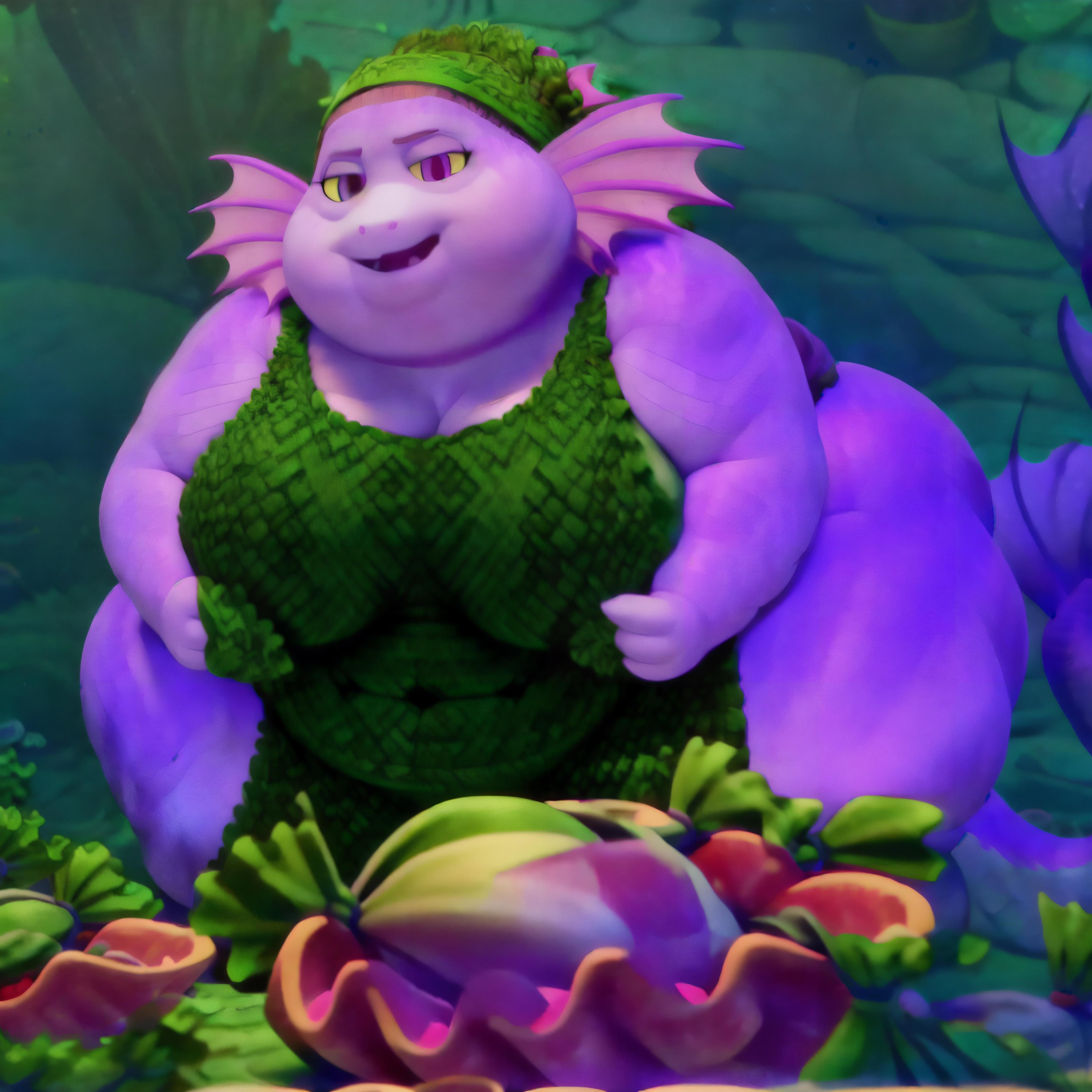 3d cartoon, cartoon accurate, anatomically correct, perfect ???????, 4k, 8k, quality lighting, perfect face, detailed hands, detailed eyes, perfect face, detailed background, solo, Grandma, ssbbw, light magenta scales, purple fins on her head to replicate her hair, light pink eyes, faint yellow sclera, oval shaped pupils, dress, bandana made from seaweed, (long tail forms a twirl with purple caudal fins), wrinkles, old lady