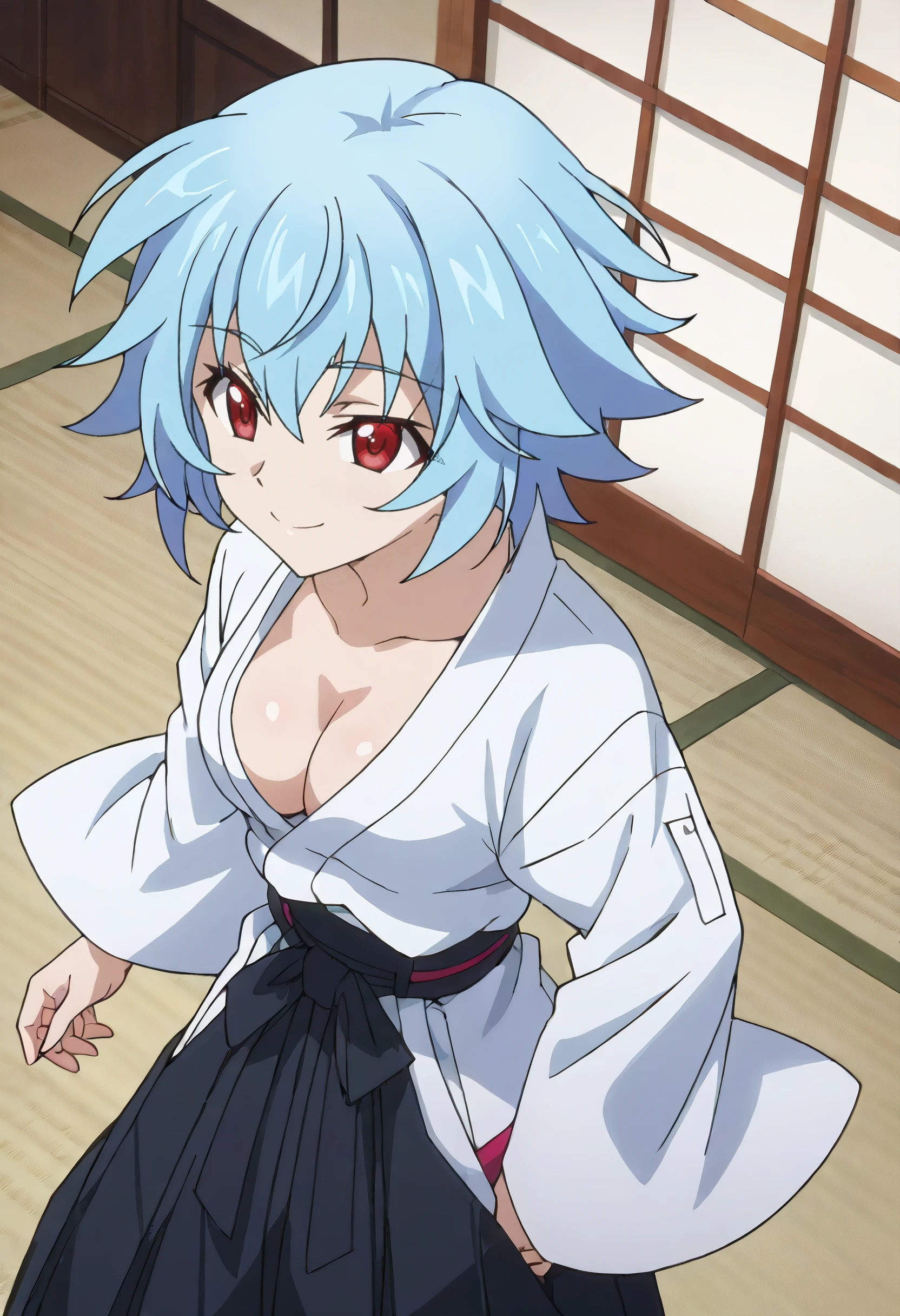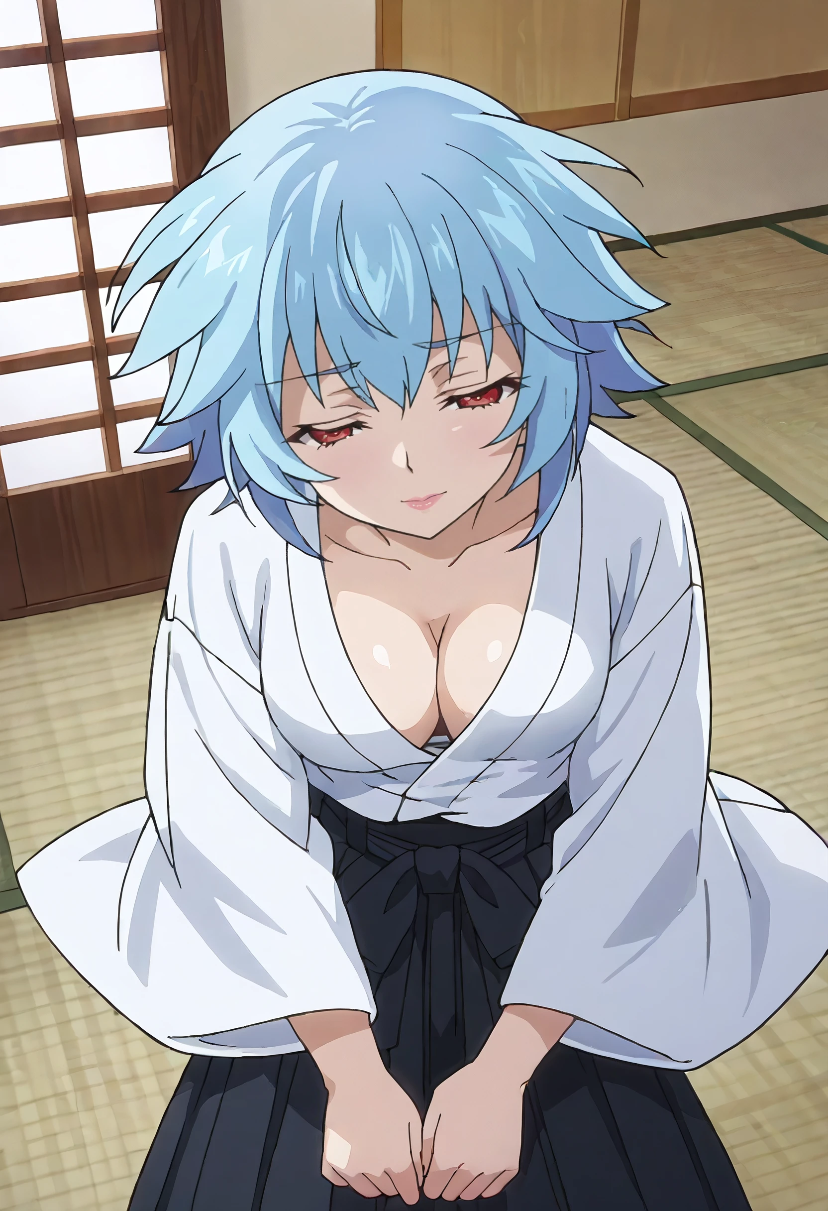 TatenashiKimono, japanese clothes, hakama, black hakama, long sleeves, hakama skirt, skirt, kimono, white kimono, miko, wide sleeves, cleavage, hip vent,