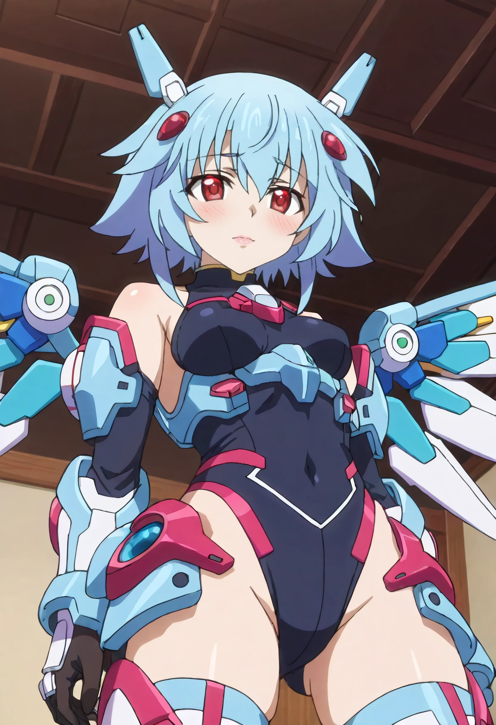 TatenashiArmor, headgear, mecha musume, leotard, bodysuit, thighhighs, covered navel, armor, wings, mechanical wings, bare shoulders, hair ornament, gloves, gauntlets, black thighhighs, black leotard,