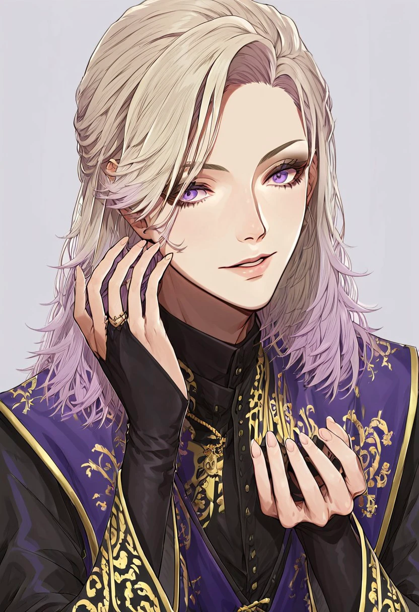 Blonde hair, solo, earrings, with long, crown, fair-skinned young man with shoulder-length hair and light-purple eyes. His hair is light-blonde, side-parted bangs and two loose braids on both sides, Vil is always seen wearing makeup, simple background, holding, makeup, multicolored hair, male focus, looking at viewer, the most common of which being brown eyeshadow, upper body, cape, jewelry, and fades into a light-purple color at the tips. His usual hairstyle leaves his hair down,