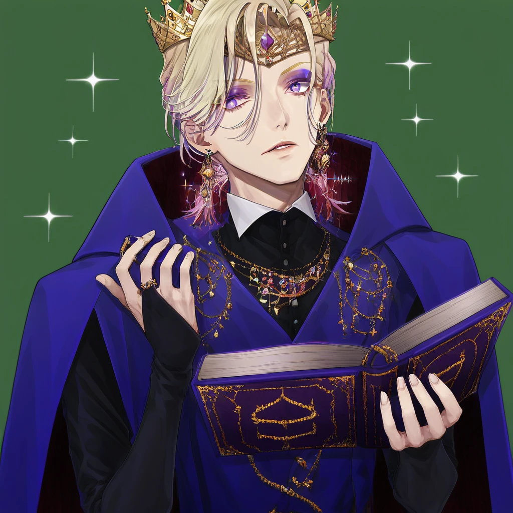 score_9, score_8_up, source_anime, highly detailed,book, Blonde hair, solo, earrings, with long, crown, fair-skinned young man with shoulder-length hair and light-purple eyes. His hair is light-blonde, side-parted bangs and two loose braids on both sides, Vil is always seen wearing makeup, simple background, holding, makeup, multicolored hair, male focus, looking at viewer, the most common of which being brown eyeshadow, upper body, cape, jewelry, and fades into a light-purple color at the tips. His usual hairstyle leaves his hair down, sparkle, Vil is a tall,dorms uniform