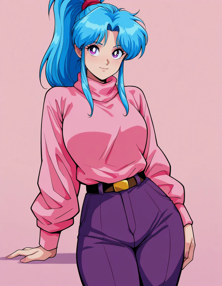 turtleneck sweater, pink sweater, belt, purple pants, pants,