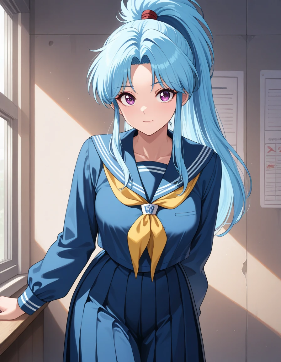 school uniform, serafuku, long sleeves, blue shirt, yellow neckerchief, blue sailor collar, blue skirt, pleated skirt, long skirt,