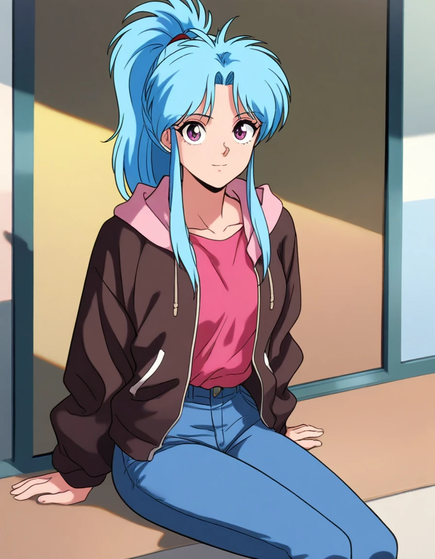 blue hair, purple eyes, parted bangs, sidelocks, ponytail,