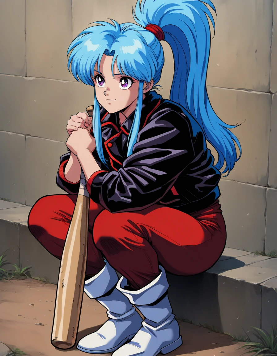 weapon, boots, white footwear, baseball bat, holding baseball bat, jacket, pants, red pants, outdoors, holding, black jacket, wall,