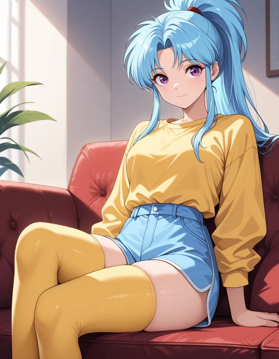 long sleeves, blue shorts, yellow thighhighs, blue hair, shirt tucked in, yellow shirt, on couch,