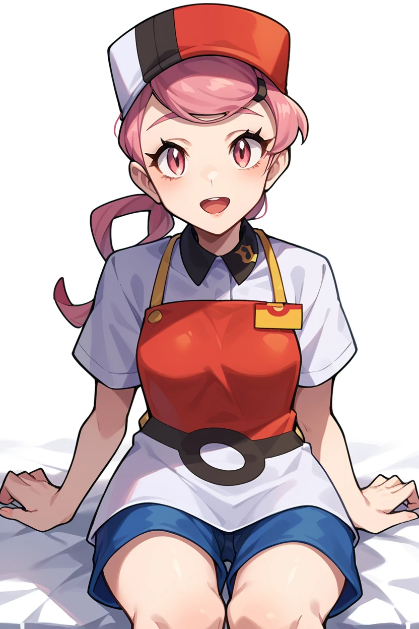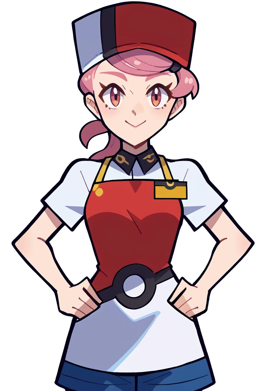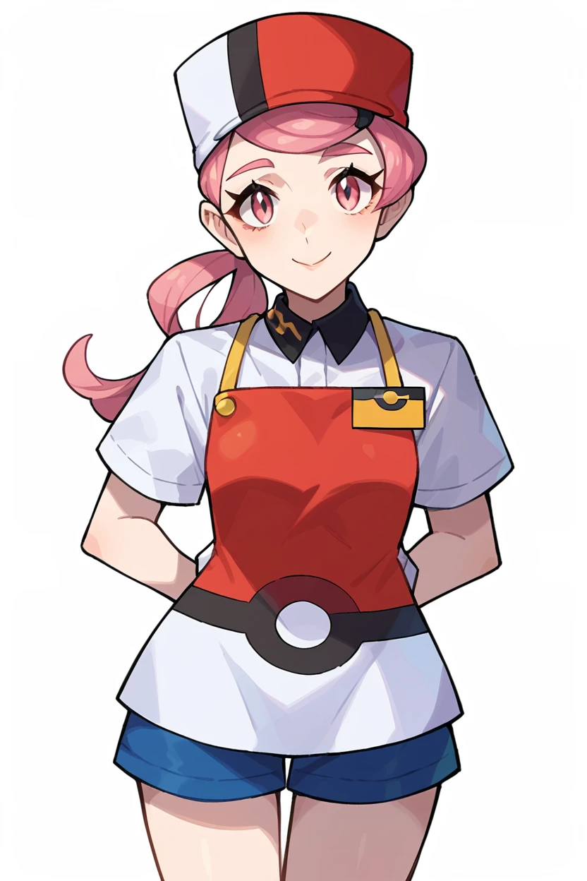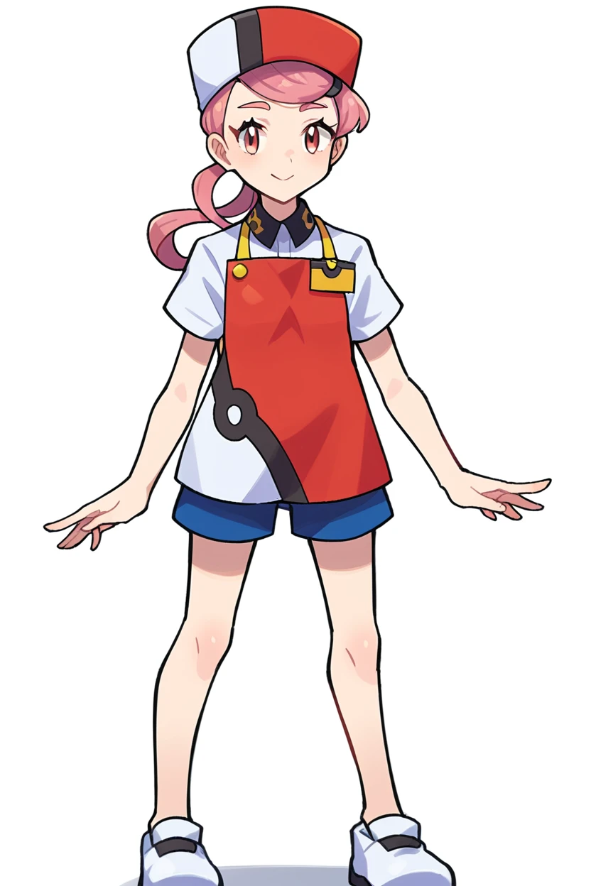 Key word is pkmncenternurse_sv and for default outfit use: pink hair, hat, black collar, white shirt, pokeball_apron, blue shorts, nametag, white shoes,