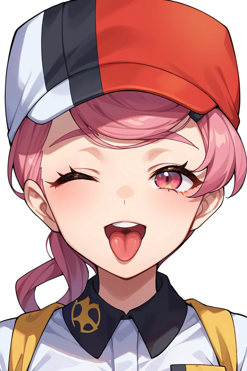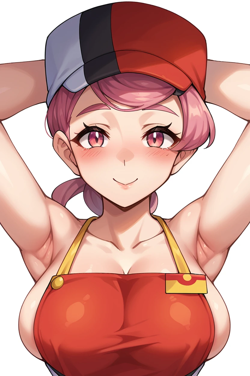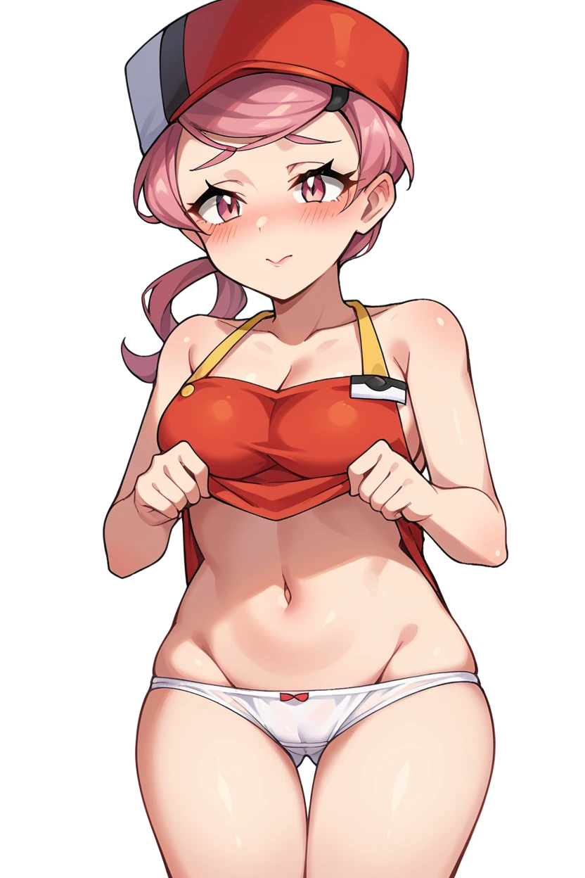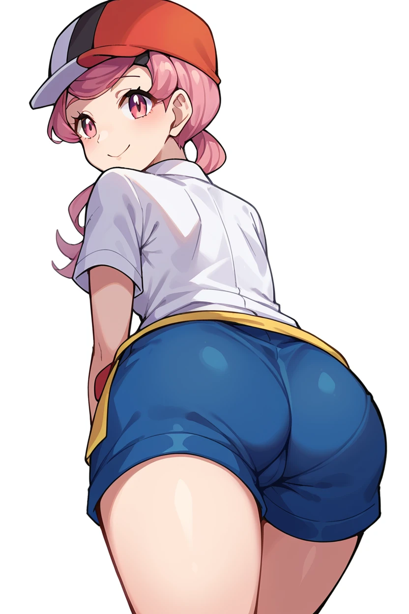 Key word is pkmncenternurse_sv and for default outfit use: pink hair, hat, black collar, white shirt, pokeball_apron, blue shorts, nametag, white shoes,