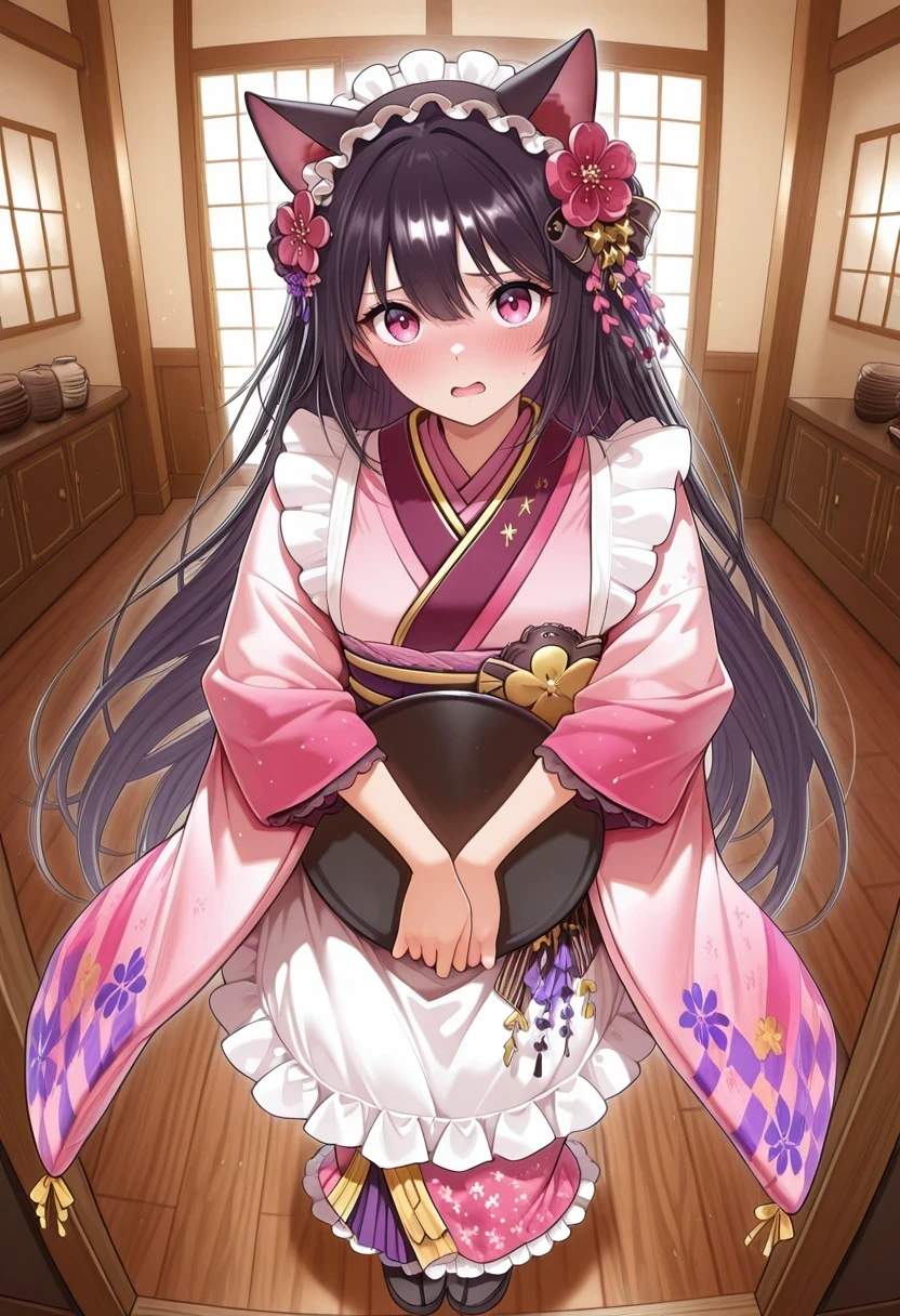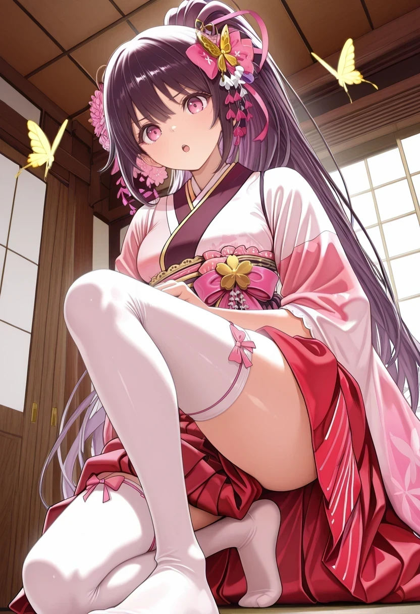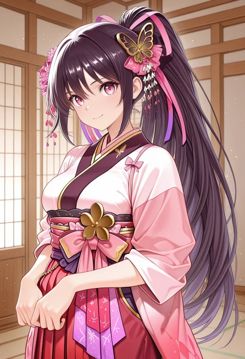 japanese clothes,ponytail,pink kimono,red hakama skirt,two-tone kimono,yellow butterfly hair ornament,pink ribbon,pink bow,School: