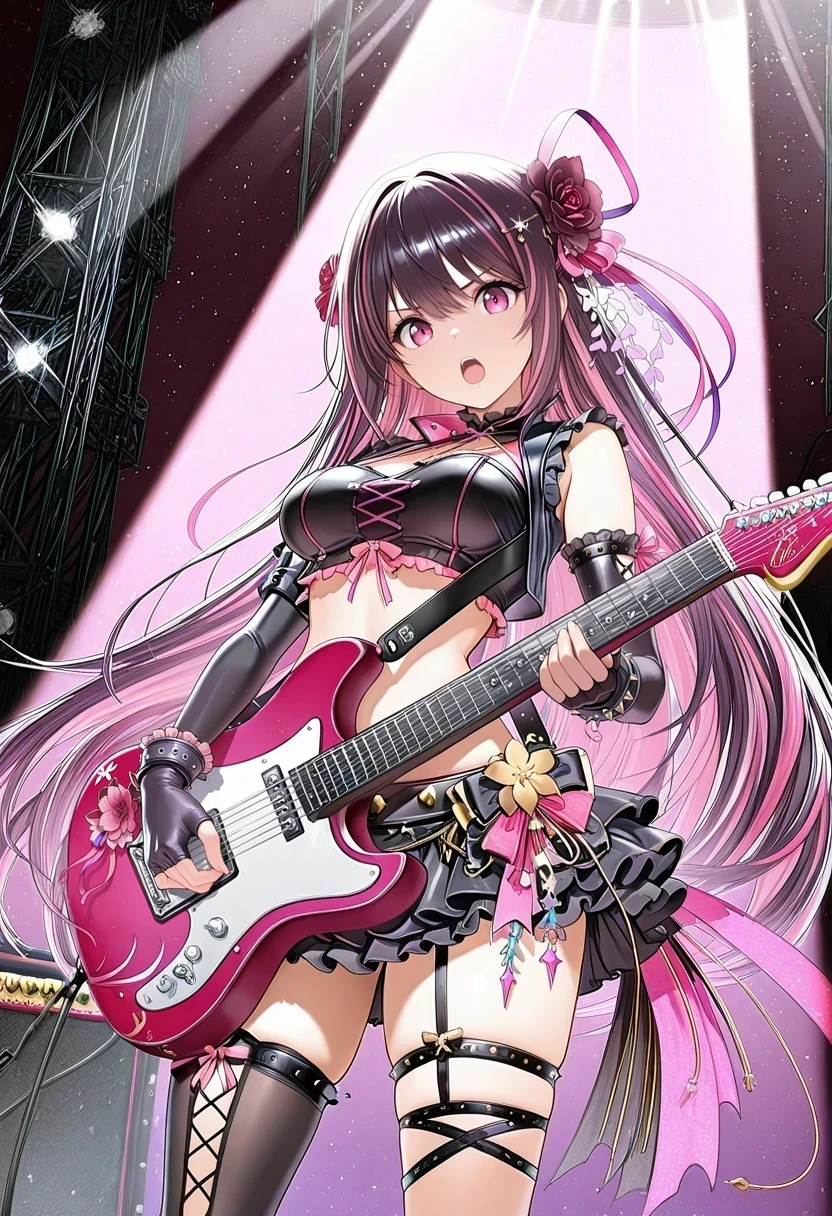 streaked hair,pink hair,crop top,black elbow gloves,fingerless gloves,garter straps,black thighhighs,single thighhigh,pink ribbon,black miniskirt,frills,Band(casual):