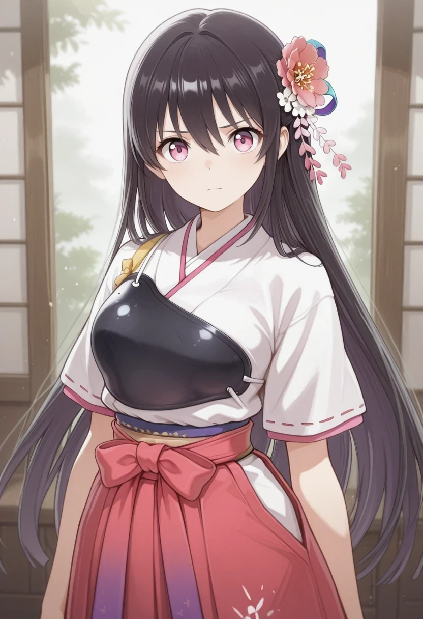 red hakama,muneate,straight hair,hair ornament,red obi,black bridal gauntlets,Bikini: