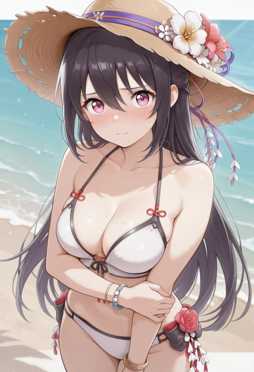 white bikini,straw hat,hat flower,bracelet,flower on bikini,Pick: