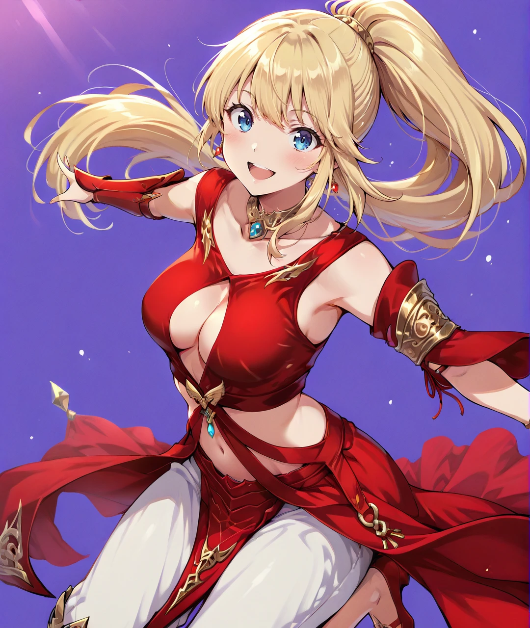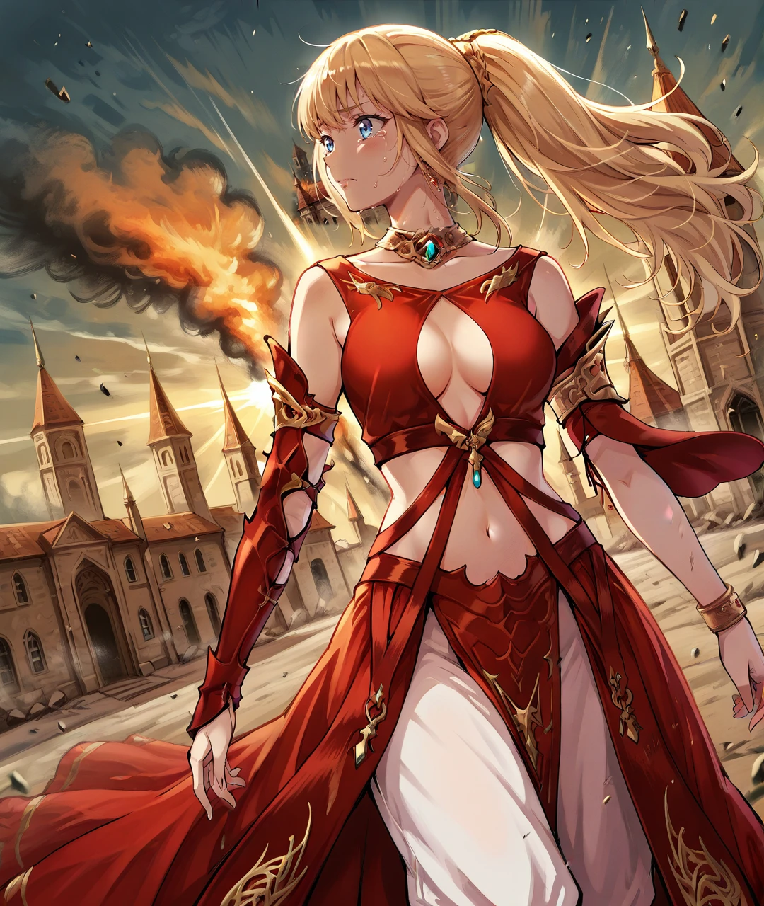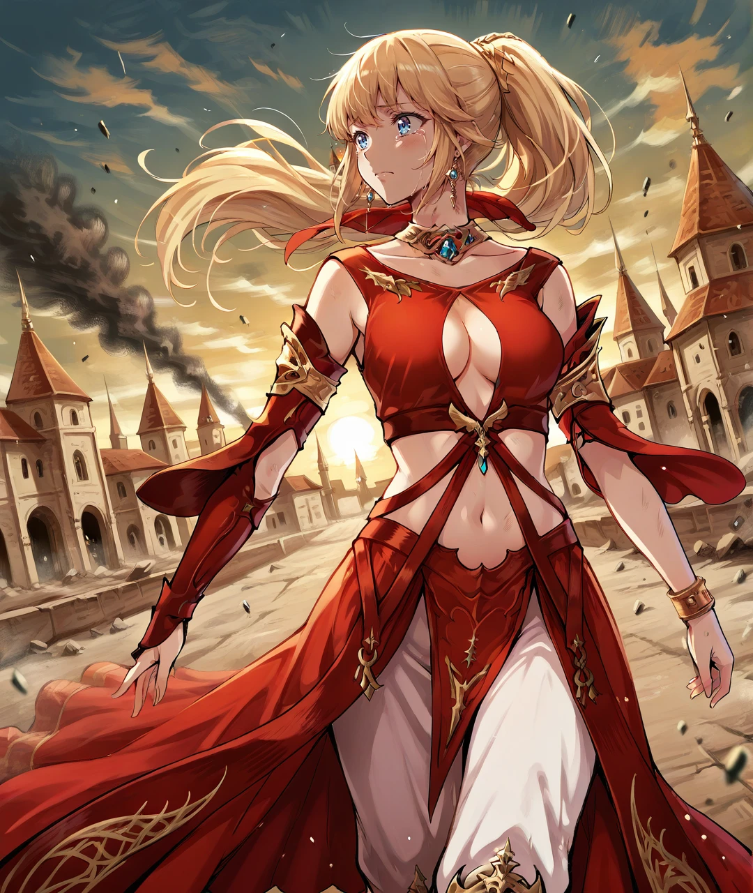 LyseBase, blue eyes, blonde hair, long hair, ponytail, earrings, gold choker, gold jewelry, blue gems, bare shoulders, collarbone, medium breasts, cleavage, red crop top, red dress, long dress, clothing cutout, detached sleeves, asymmetrical sleeves, arm guard, long glove, red silk scarf, gold bracelet, midriff, navel, red skirt, white pants, capri pants, gold decorations, red footwear, high heels,