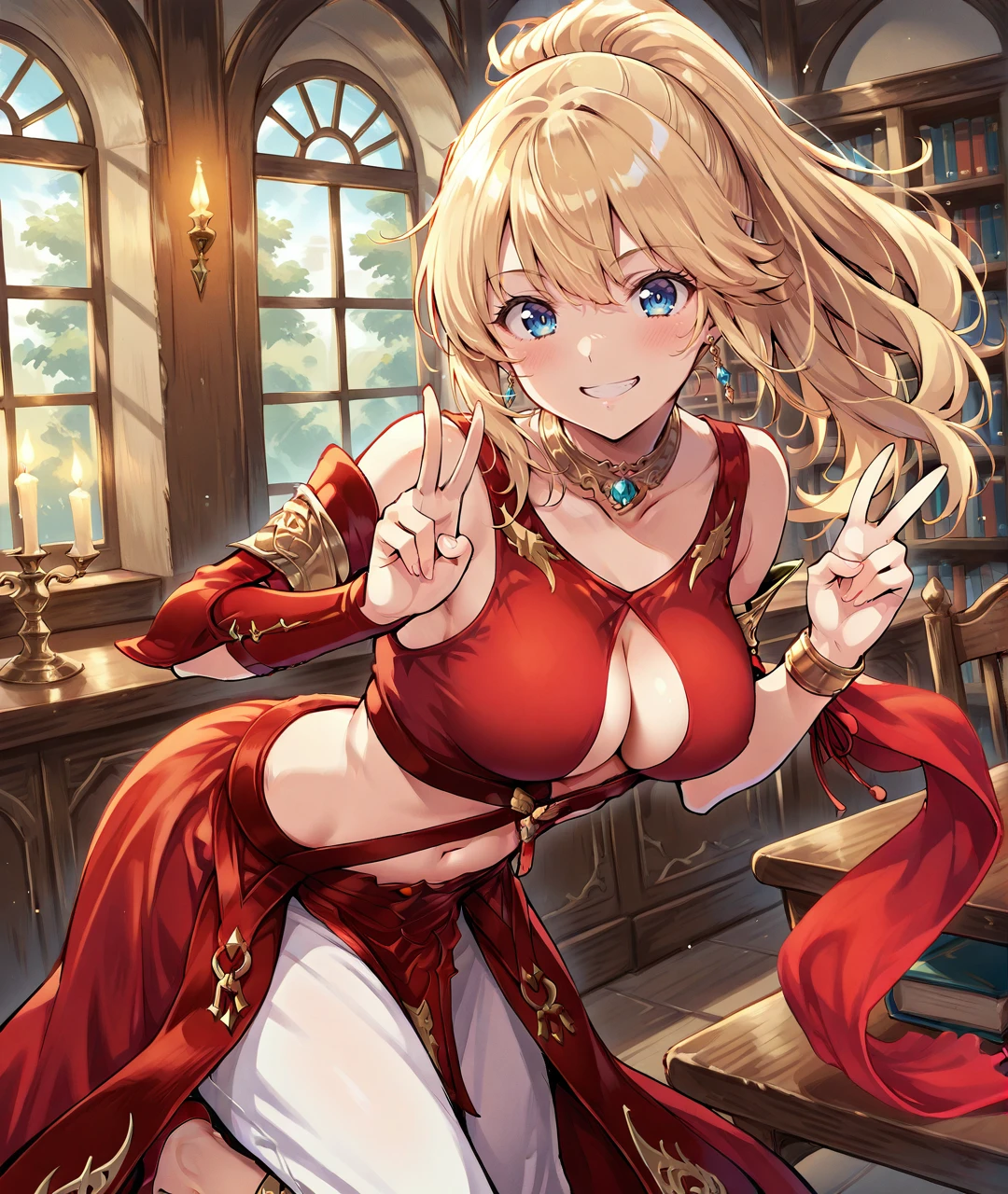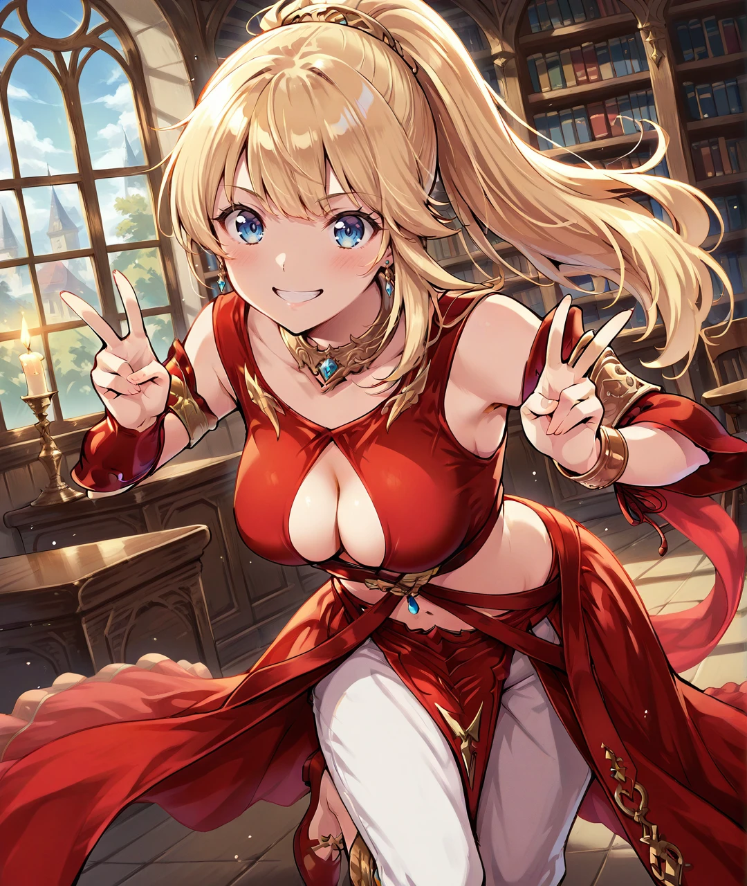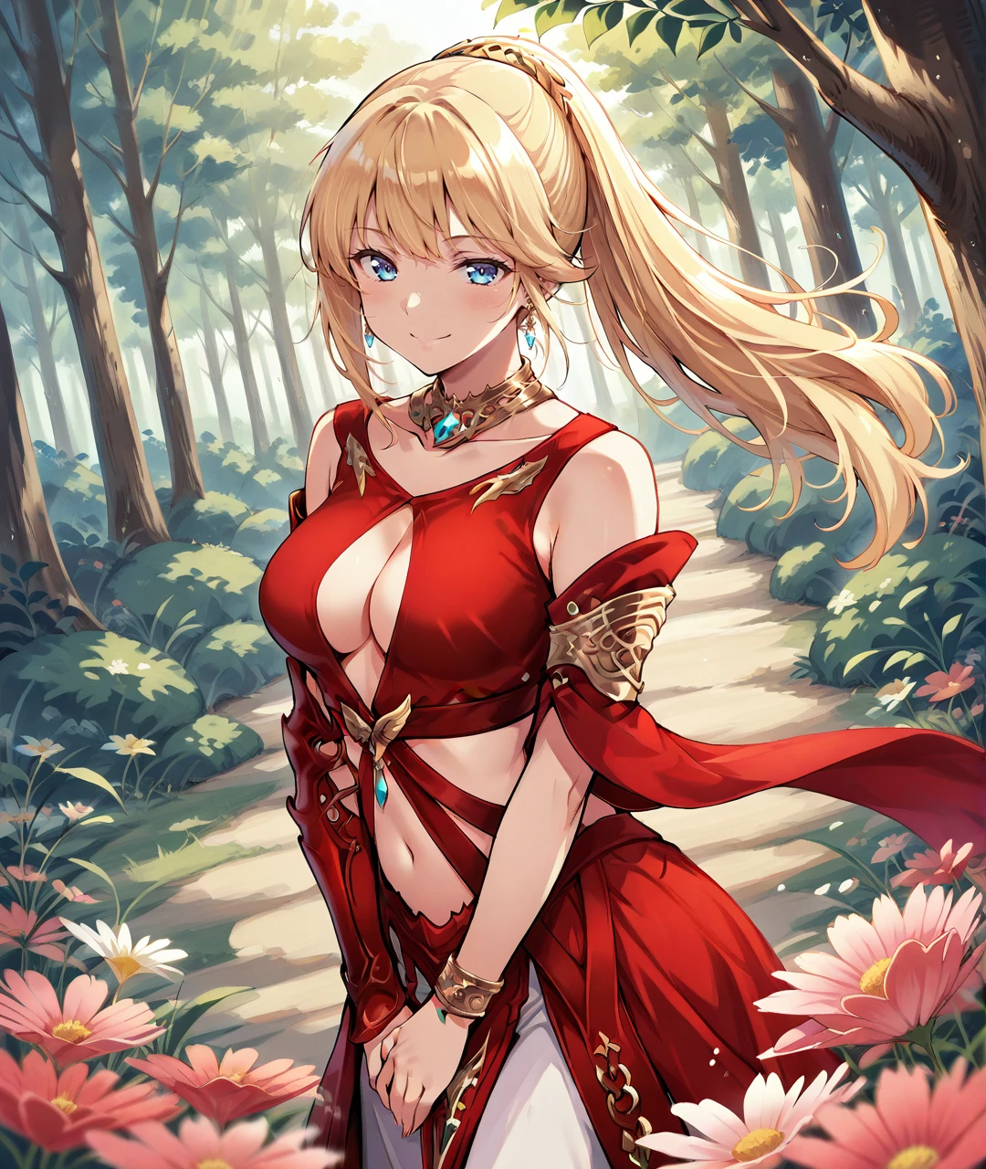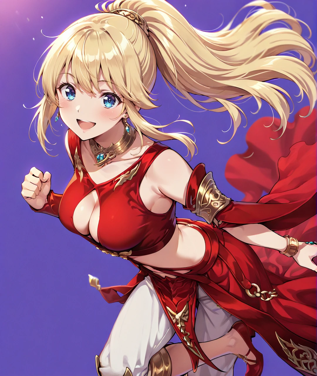 LyseBase, blue eyes, blonde hair, long hair, ponytail, earrings, gold choker, gold jewelry, blue gems, bare shoulders, collarbone, medium breasts, cleavage, red crop top, red dress, long dress, clothing cutout, detached sleeves, asymmetrical sleeves, arm guard, long glove, red silk scarf, gold bracelet, midriff, navel, red skirt, white pants, capri pants, gold decorations, red footwear, high heels,