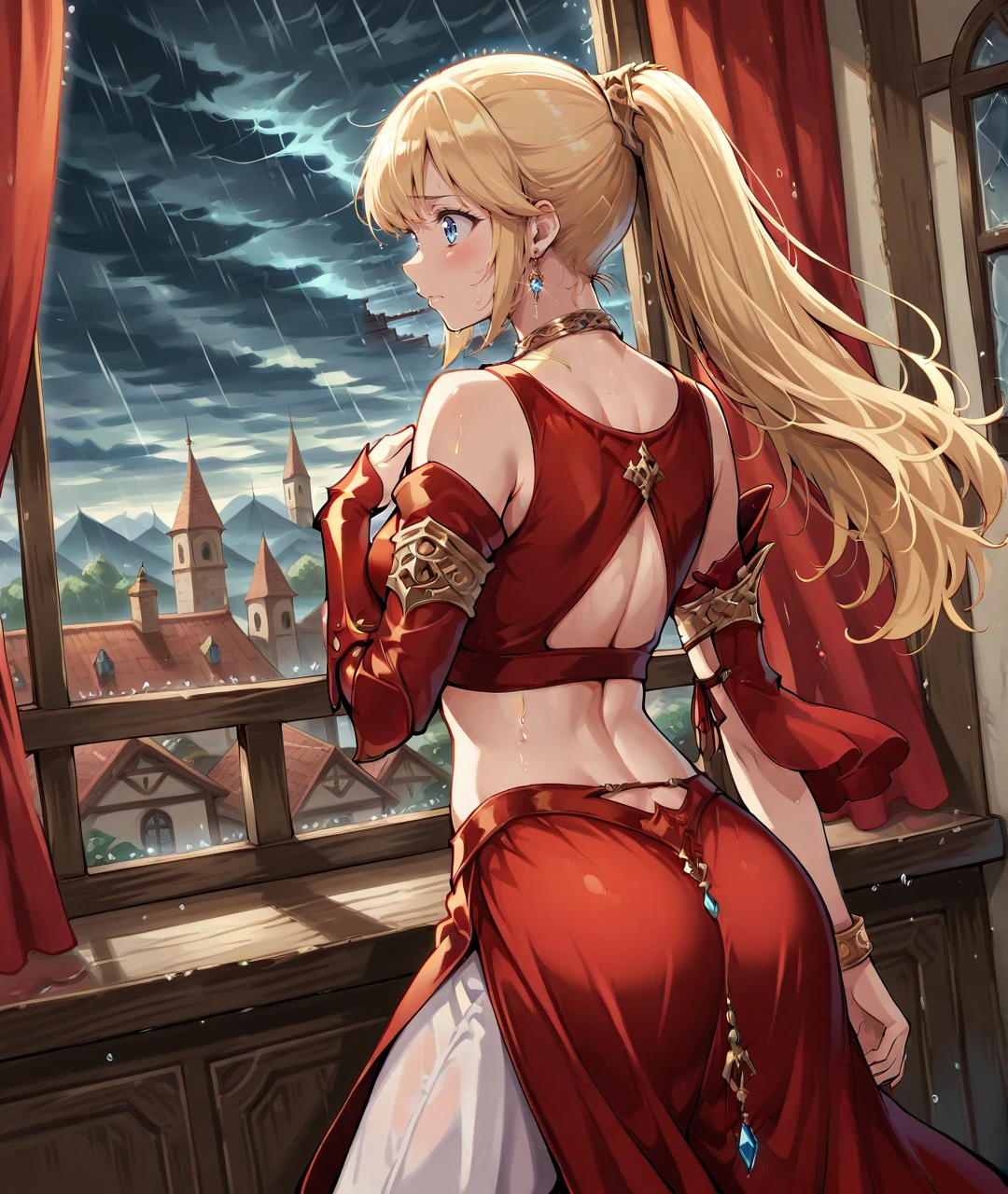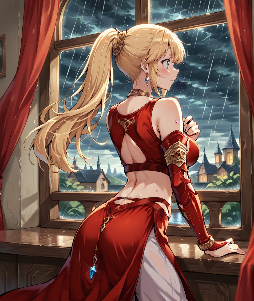 Tags: LyseBase, blue eyes, blonde hair, long hair, ponytail, earrings, gold choker, gold jewelry, blue gems, ???? shoulders, collarbone, ??????????????, cleavage, red crop top, red dress, long dress, clothing cutout, detached sleeves, asymmetrical sleeves, arm guard, long glove, red silk scarf, gold bracelet, midriff, navel, red skirt, white pants, capri pants, gold decorations, red footwear, high heels,