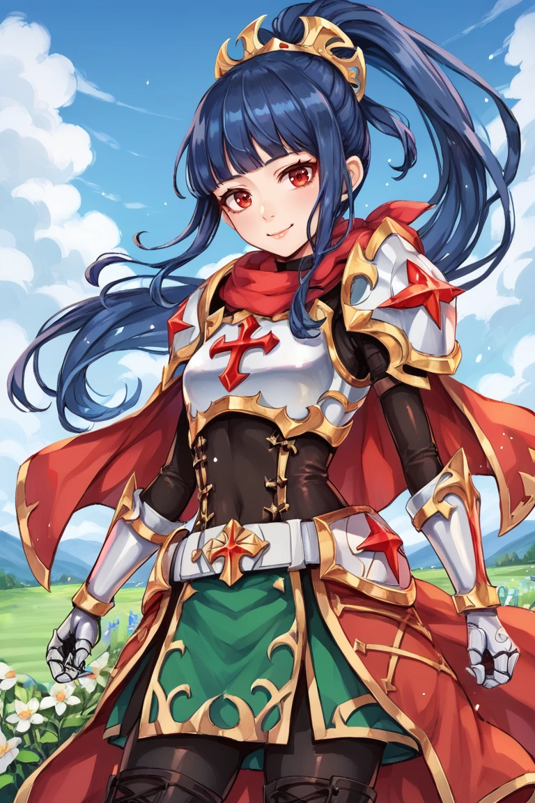 <lora:Claire__Colt:0.60>, Clabase, ClaAlt, 1girl, red eyes, blue hair, long hair, ponytail, sidelocks, braided bun, single hair bun, helmet, visor (armor), armor, white popped collar, breastplate, cuirass, gauntlets, greaves, pauldrons, high-low skirt, armored skirt, armored dress, skirt under dress, blue skirt, gold trim, cape, red cape, (smile),